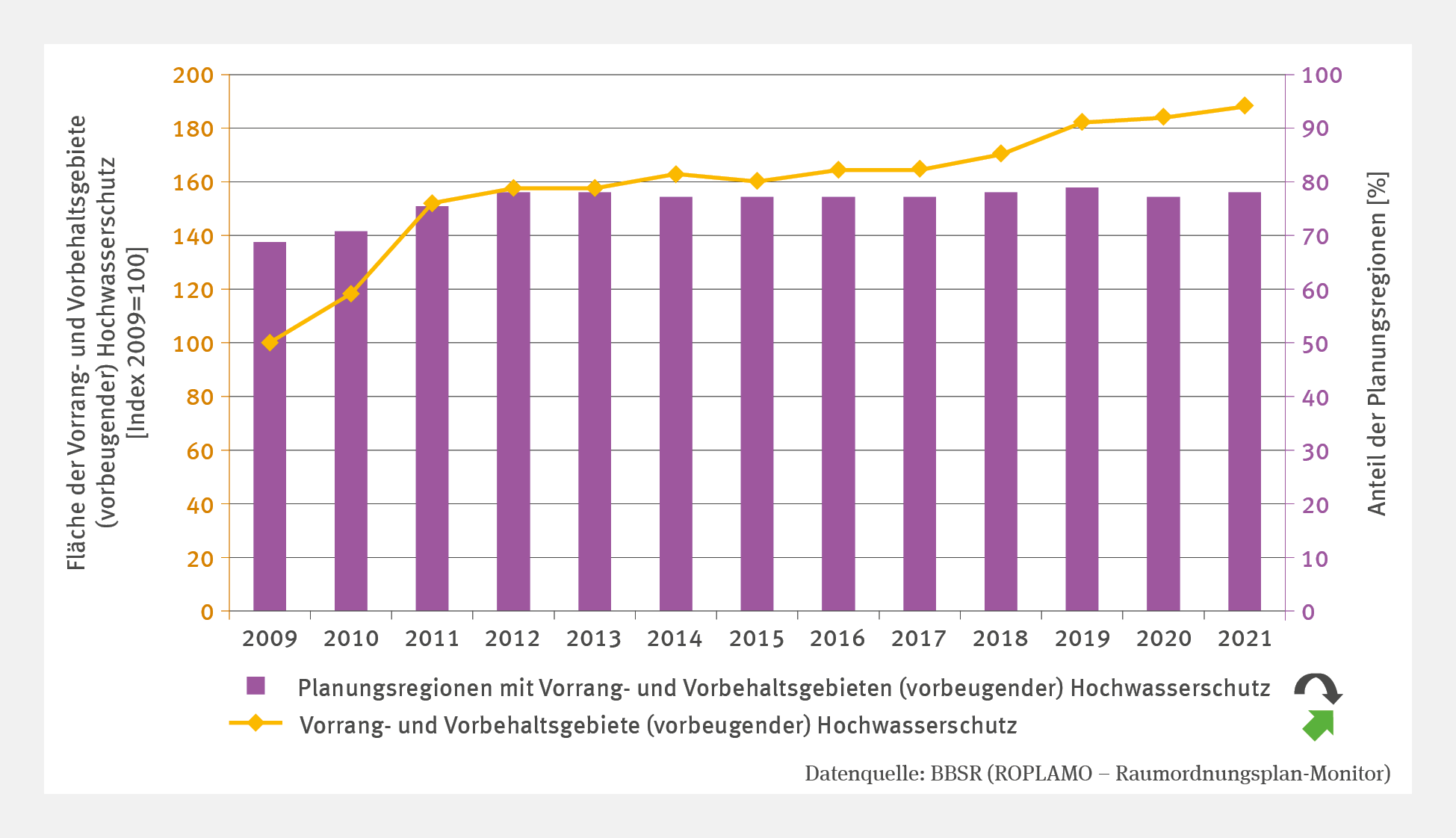 Die Festsetzung von Überschwemmungsgebieten sollte nach den Vorgaben des WHG bis Ende 2013 abgeschlossen sein. Es war zu erwarten, dass in der Folge auch zahlreiche Planungsregionen die Ausweisung von Vorrang- und Vorbehaltsgebieten für den vorbeugenden Hochwasserschutz nachführen oder erstmalig vornehmen. Im Jahr 2021 waren in den Planungsregionen der Regionalplanung insgesamt rund 13.500 km² Fläche als Vorrang- und Vorbehaltsgebiete ausgewiesen. Obwohl die Anzahl der ausweisenden Planungsregionen in den letzten 10 Jahren annähernd konstant blieb, nahm die für den vorbeugenden Hochwasserschutz deutschlandweit festgelegte Fläche im Zuge von Fortschreibungen und Neuaufstellungen von Regionalplänen weiter zu. Insgesamt ist seit 2009 ein Anstieg der ausgewiesenen Fläche um rund 6.300 km² zu verzeichnen.
