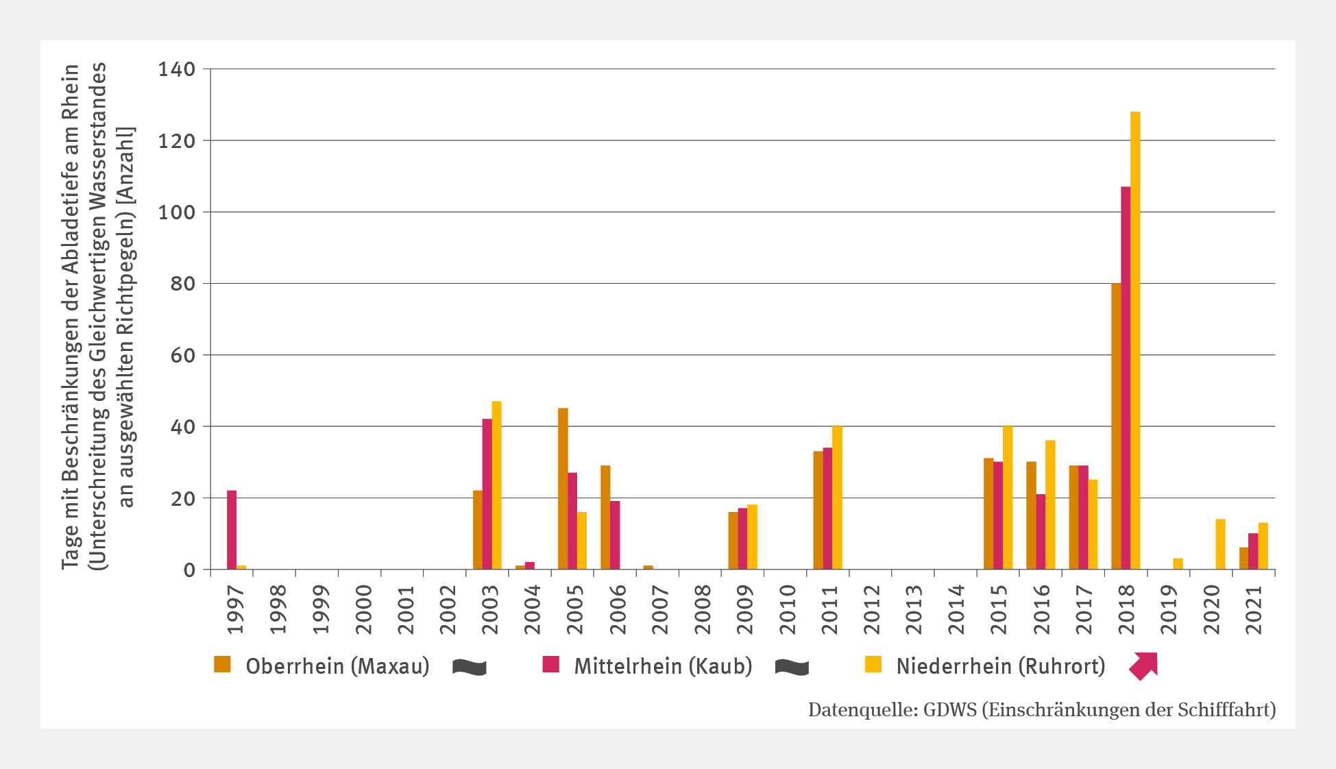 Das Säulendiagramm "Niedrigwassereinschränkungen am Rhein" zeigt die Anzahl der Tage mit Unterschreitung des gleichwertigen Wasserstands an den Pegeln Maxau (Oberrhein), Kaub (Mittelrhein) und Ruhrort (Niederrhein) von 1997–2021. Diese führen zu Beschränkungen der Abladetiefen. Während Ober- und Mittelrhein keinen signifikanten Trend zeigen, weist der Niederrhein einen signifikant steigenden Trend auf. Spitzenwerte gab es 2018 mit 80 Tagen am Oberrhein, 107 am Mittelrhein und 128 am Niederrhein. VE-I-2: Niedrigwassereinschränkungen am Rhein