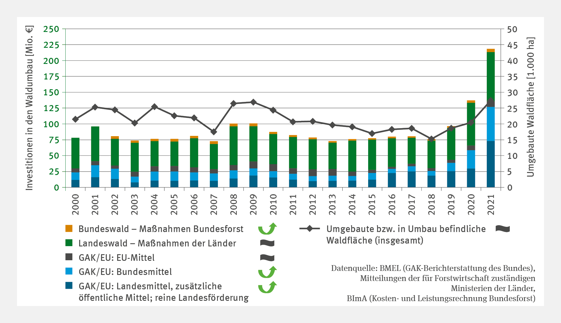 Der bundeseigene Wald umfasst in Deutschland nur 4 % der Waldfläche. Es handelt sich im Wesentlichen um Wald auf (ehemaligen) Truppenübungsplätzen sowie entlang von Bundeswasserstraßen und Autobahnen, der von der Bundesanstalt für Immobilienaufgaben (BImA) / Sparte Bundesforst betreut wird. Auch im Bundeswald werden nicht standortgerechte Bestände in stabile und naturnähere Wälder umgebaut. 2021 wurde die Mittel hierfür gegenüber den drei Vorjahren mehr als verdoppelt, bewegte sich aber in der gleichen Größenordnung wie 2017. Gemessen am Anteil des Landeswalds von 29 % an der Waldfläche in Deutschland war der Anteil der in den Umbau des Landeswalds fließenden Mittel am bundesweiten Mitteleinsatz von 2011 bis 2020 mit knapp 57 % überproportional hoch. Der Anteil der Mittel zum Umbau der Privat- und Körperschaftswälder mit rund 67 % der Waldfläche war demgegenüber mit durchschnittlich 40 % geringer. Mit dem zusätzlichen GAK-Fördertatbestand hat sich dieses Verhältnis ab 2020 umgekehrt. In die Privat- und Körperschaftswälder flossen in 2020 62 % der Mittel.