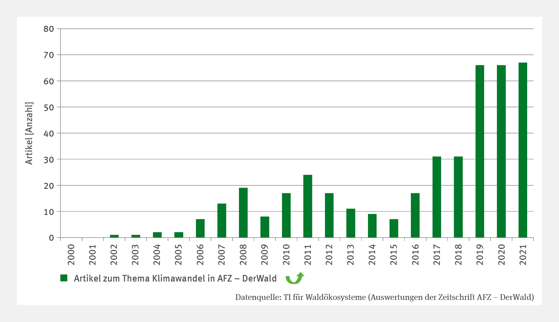 Ein wichtiges Mittel, forstlich relevante Informationen zu verbreiten, sind Zeitschriften, die insbesondere von Personen aus der forstwirtschaftlichen Praxis gelesen werden. Zu diesen Zeitschriften gehört unter anderem die „AFZ DerWald“, die unter den forstlichen Zeitschriften aufgrund ihrer kurzgefassten Artikel in deutscher Sprache derzeit die öffentlichkeitswirksamste ist. Artikel, die in dieser Zeitschrift zum Thema Klimawandel und Anpassung veröffentlicht werden, erreichen einen sehr großen Kreis von Lesenden, die sich mit forstlichen Bewirtschaftungsfragen auseinandersetzen.