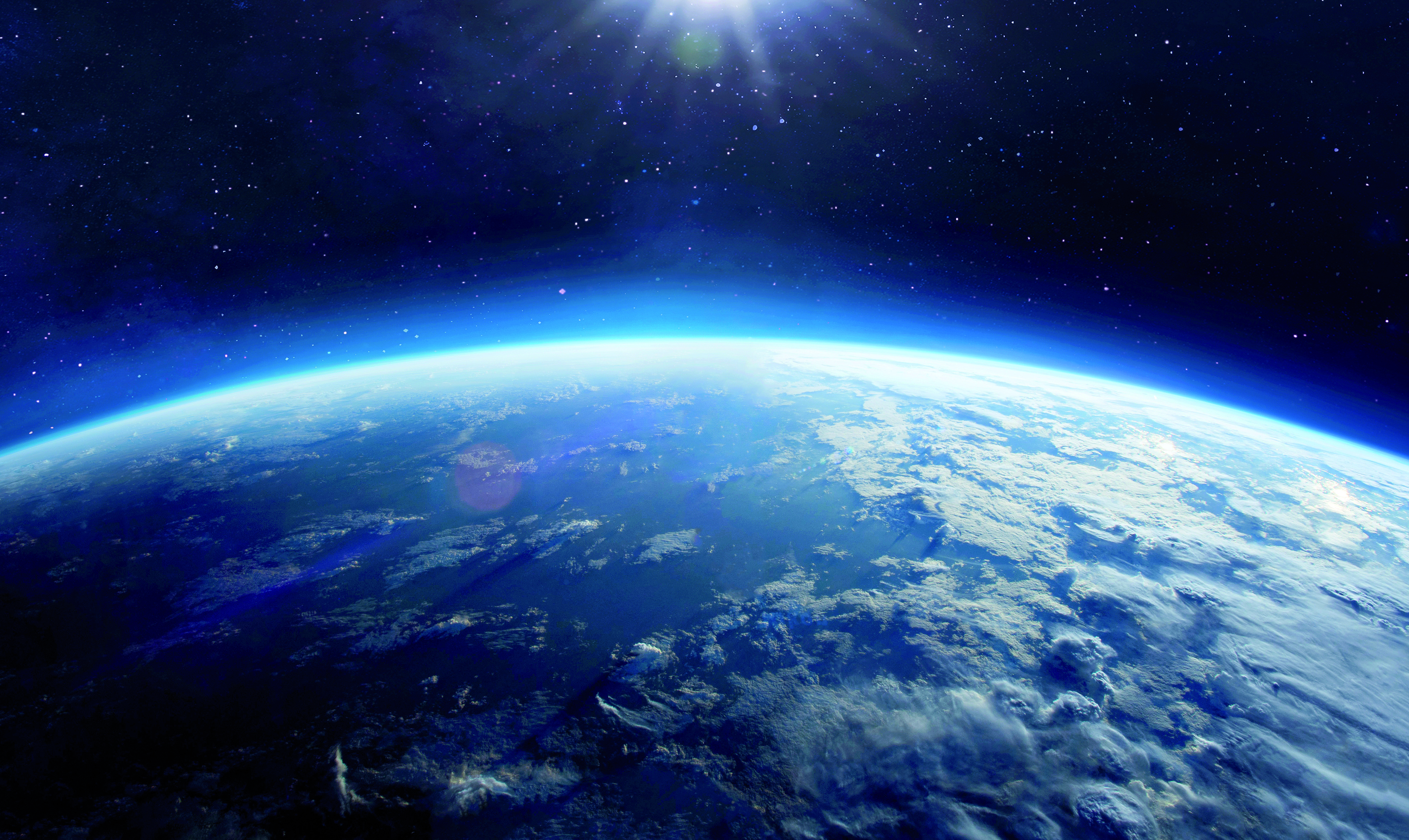 Das Bild zeigt den Ausschnitt einer Satelitenaufnahme von der Erde. Am oberen Bildrand strahlt die Sonne. Auf der Erde sind Wolken und der blaue Ozean zu erkennen.