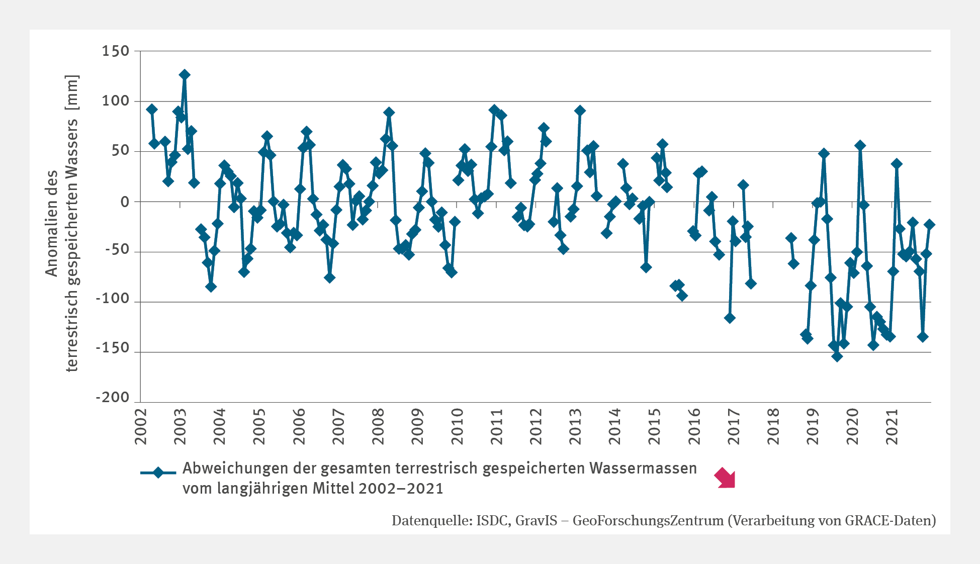 Das terrestrisch gespeicherte Wasser im Bereich der Bundesrepublik hat in den zurückliegenden 20 Jahren signifikant abgenommen. Vor allem in den Dürrejahren 2018–2020 gibt es deutliche negative Abweichungen vom Mittel der gesamten Zeitreihe. Die Zeitreihe basiert auf satellitengravimetrischen Daten der GRACE-Missionen, die das Schwerefeld der Erde vermessen und sowohl oberirdische als auch unterirdische Wasserspeicher erfassen können.