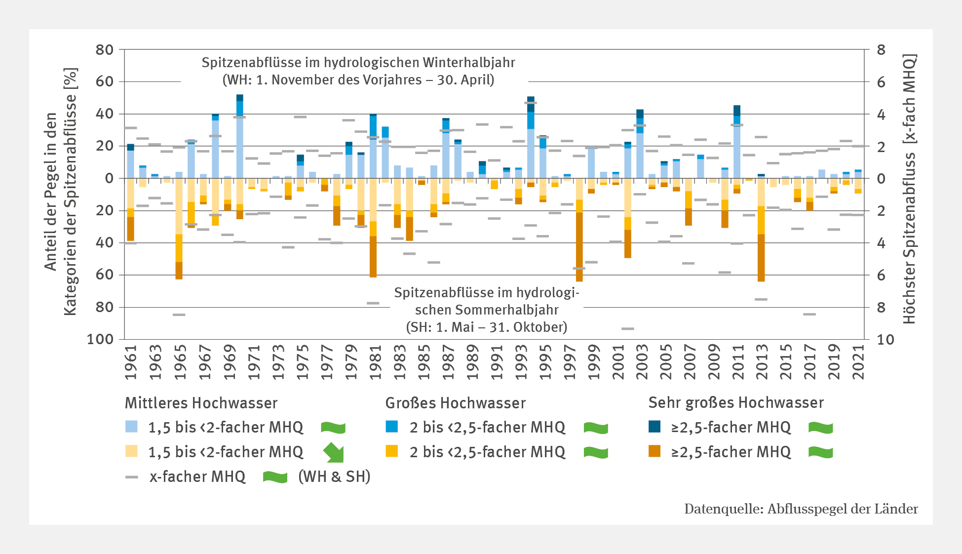 Das Säulendiagramm WW-I-5 "Spitzenabflüsse in Fließgewässern" zeigt für die Jahre 1961 bis 2021 die höchsten Spitzenabflüsse an ausgewählten Pegeln im Winter- und Sommerhalbjahr sowie den Anteil der Pegel in den Kategorien mittleres, großes und sehr großes Hochwasser. Im Sommerhalbjahr können Spitzenabflüsse bis zum 9-fachen des MHQ erreichen, mit einem Höchstwert von fast dem 10-fachen im Jahr 2002. Nur der Anteil der Pegel mit mittlerem Hochwasser sank signifikant. WW-I-5: Spitzenabflüsse in Fließgewässern