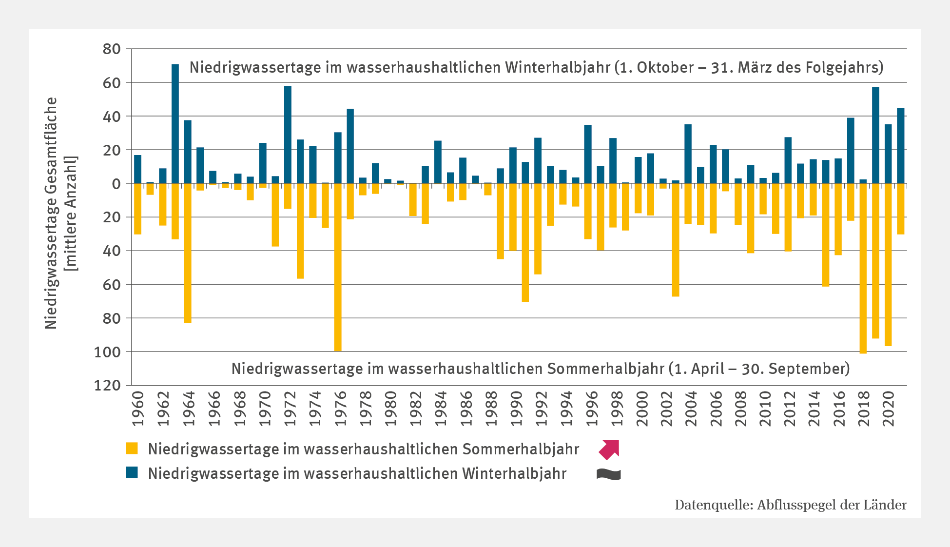 Für die dargestellte Zeitreihe wurden die Abflusswerte von 76 Pegeln an deutschen Flüssen daraufhin ausgewertet, an wie vielen Tagen im wasserhaushaltlichen Sommerhalbjahr (1. April bis 30. September) und Winterhalbjahr (1. Oktober bis 31. März des Folgejahres) Niedrigwasser aufgetreten ist. Ein Niedrigwassertag ist definiert als ein Tag, an dem der mittlere jährliche Tagesabfluss niedriger ist als der für den jeweiligen Pegel ermittelte mittlere Niedrigwasserabfluss (MNQ) der Zeitspanne 1961–1990. Der MNQ wird aus den jeweils niedrigsten Abflüssen der einzelnen Wasserhaushaltsjahre (NQ) berechnet. Mittelt man die Anzahl der Niedrigwassertage über alle betrachteten Pegel, wird deutlich, dass es immer wieder einzelne Jahre mit einer extremen Häufung von Niedrigwassertagen gegeben hat. Im Rückblick auf die letzten vier Jahrzehnte traten solche Häufungen vor allem in den Jahren 1991, 2003 und 2015 sowie zuletzt in den Jahren 2018 bis 2020 auf. Hiervon waren besonders stark die Flussgebiete Rhein, Elbe und Weser, etwas weniger ausgeprägt auch die Donau betroffen. In den Flussgebietseinheiten von Eider / Schlei, Schlei / Trave und Warnow / Peene wiesen die Wasserhaushaltsjahre 1996 und 2009 sowie die Jahre 2018 bis 2020 eine hohe Anzahl an Niedrigwassertagen auf. Niedrigwasserereignisse lassen sich in der Regel auf stabile Hochdruckwetterlagen zurückführen. Die Auswirkungen treten daher in der Regel auch sehr großräumig auf.