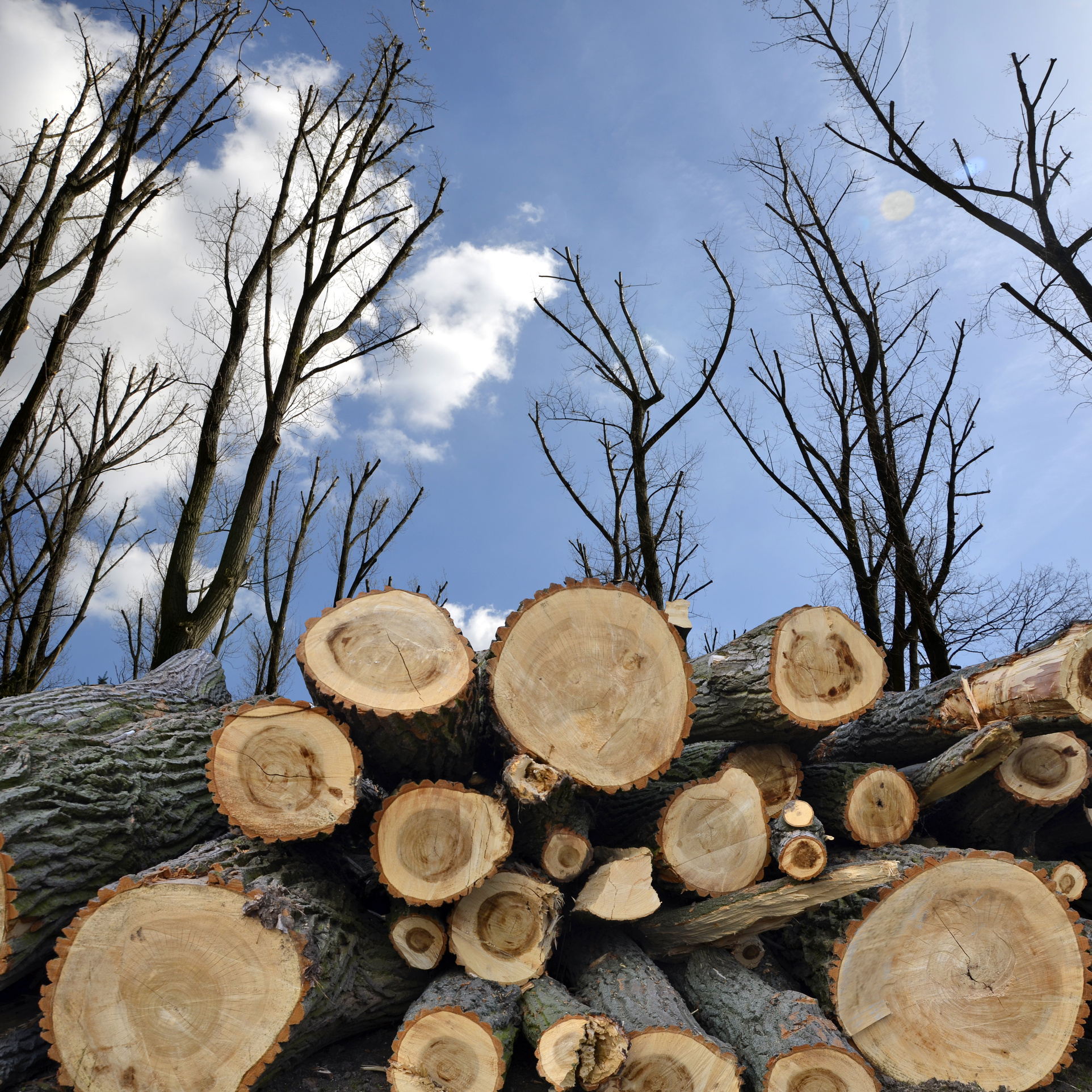 Frisch geschlagene Bäume liegen aufgestapelt im Herbstwald.
