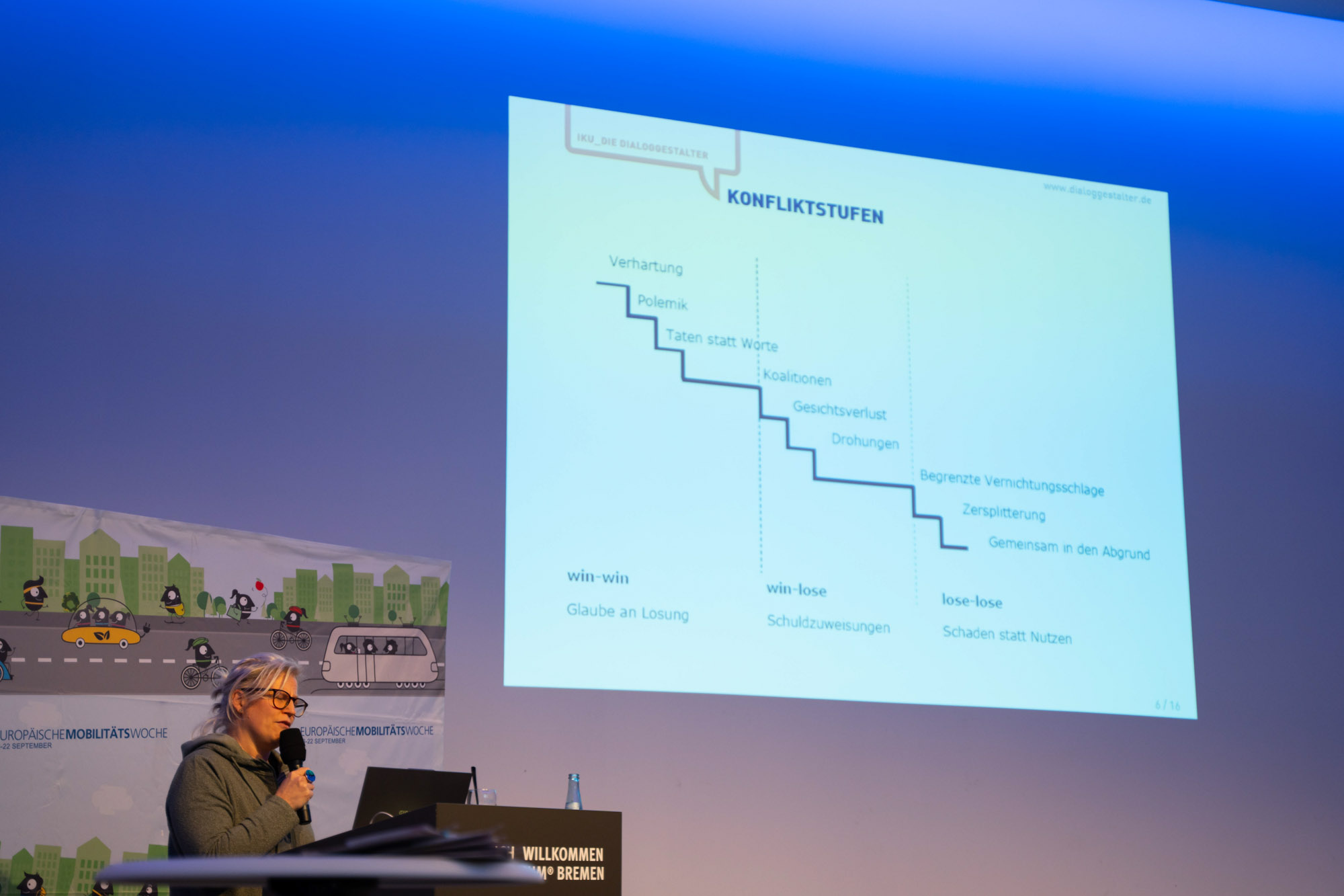 Nach der Kaffeepause mit Gesprächen entlang des „Walk of Fame“, einer Galerie mit Fotoimpressionen von der EMW 2022 in Deutschland, stand das Konfliktmanagement in kommunalen Verwaltungen zu Veränderungen im Verkehr im Zentrum. Bianca Bendisch von IKU_Die Dialoggestalter gestaltete nach ihrem Impulsvortrag zusammen mit Norbert Krause einen interaktiven Workshop, bei dem die Teilnehmenden in Kleingruppen eine Konfliktsituation in wechselnden Rollen spielen, dabei verschiedene Perspektiven einnehmen und den Umgang mit Konflikten üben konnten und dann ihre Erkenntnisse dazu mit allen teilten.