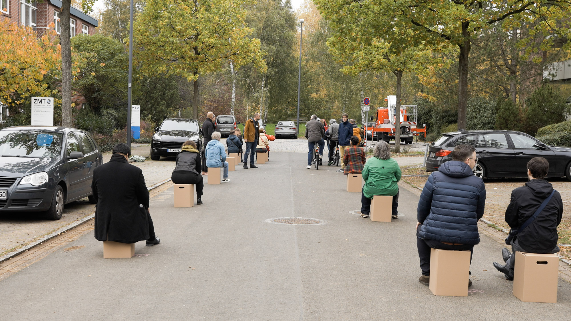 Auch dieses Mal soll als Ergebnis des Netzwerktreffens ein Film entstehen: Beim abschließenden kreativen Höhepunkt wurden die Teilnehmenden gemeinsam aktiv und visualisierten auf einem abgesperrten Straßenabschnitt den unterschiedlichen Flächenverbrauch der Verkehrsträger. Kameramann Vincent Franken fotografierte und filmte die Inszenierung von einem Hubwagen aus.