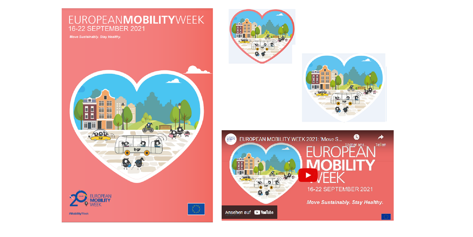 Jedes Jahr entwickelt die Europäische Kommission passend zum jeweils aktuellen Motto neue Designmaterialien für die EUROPÄISCHE MOBILITÄTSWOCHE und bietet diese auf der Webseite zum Download an. Wie immer gilt an dieser Stelle: Die Materialien können, müssen aber natürlich nicht verwendet werden.