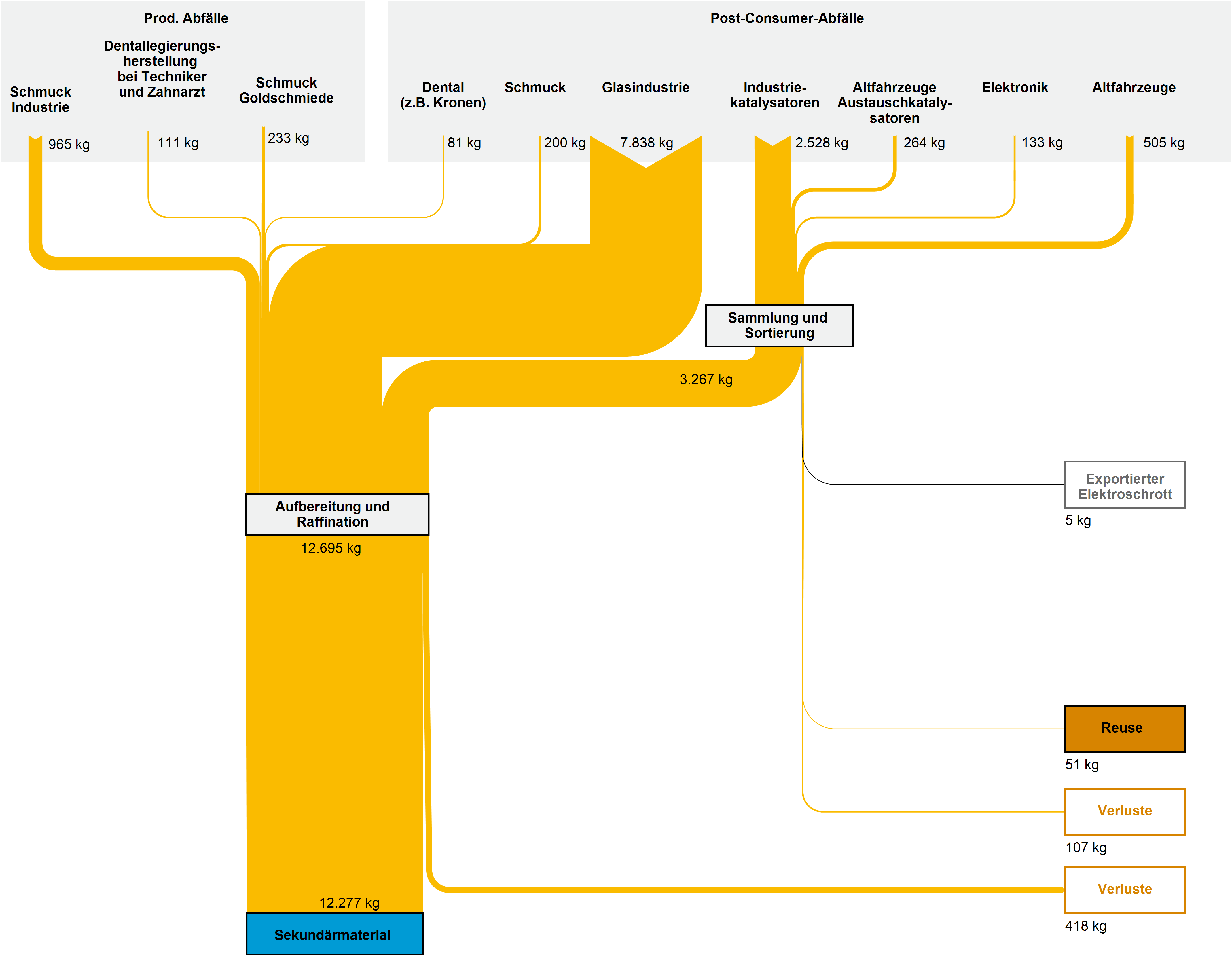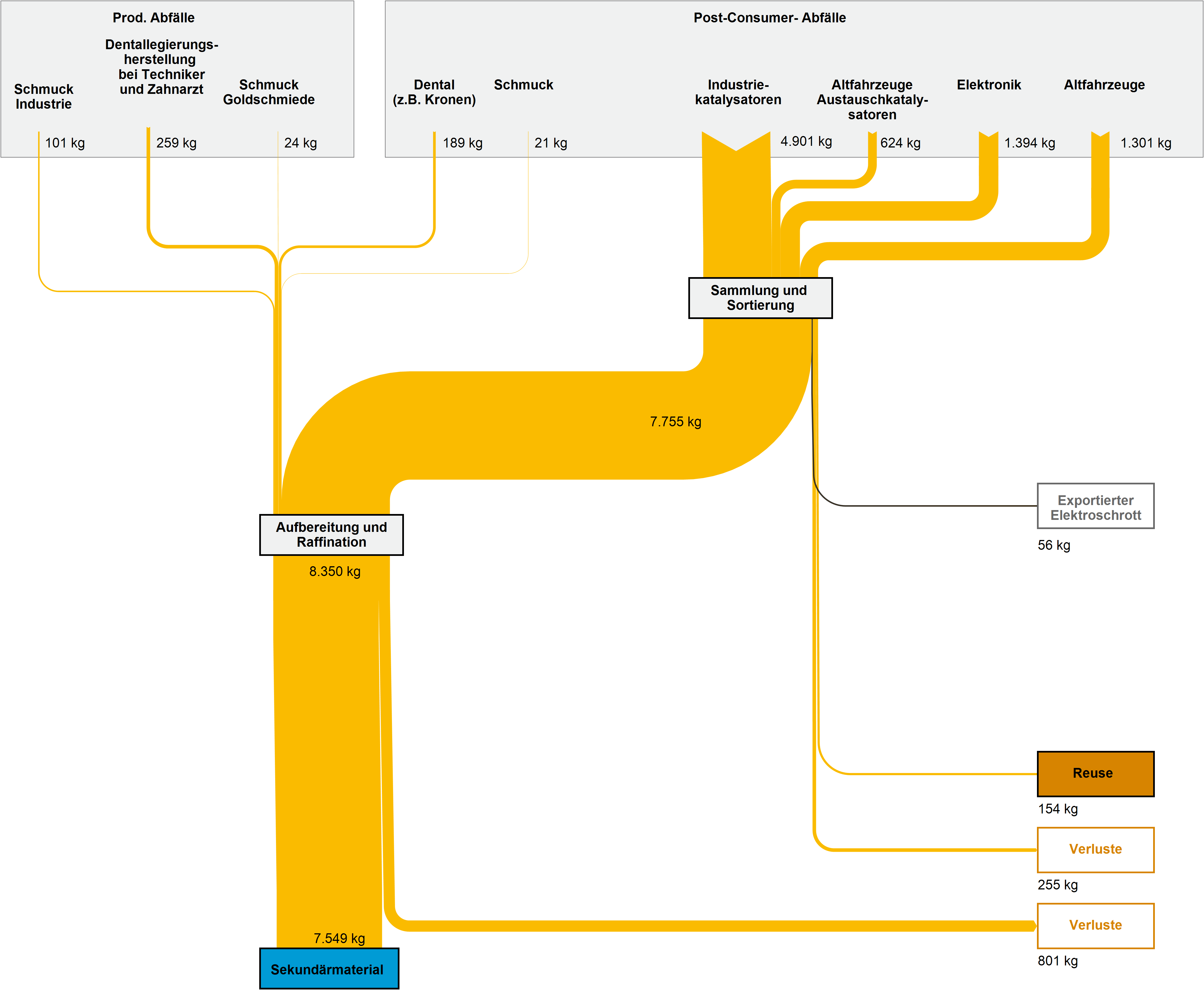 Das Recycling von Platin und Palladium aus industriellen Anwendungen findet auf einem sehr hohen Niveau statt. Die Gründe dafür sind die überschaubare Anzahl der Prozesse und Akteure sowie die bekannte Werthaltigkeit. Daher konnten sich über viele Jahre direkte und vertraglich geregelte Akteurskooperationen zwischen den Herstellern von Edelmetallkatalysatoren, den Raffinerien und den Scheideanstalten entwickeln. Größer sind die Verluste hingegen bei der Erfassung und auch Aufbereitung von platin- und palladiumhaltigen Elektro- und Elektronikschrotten.