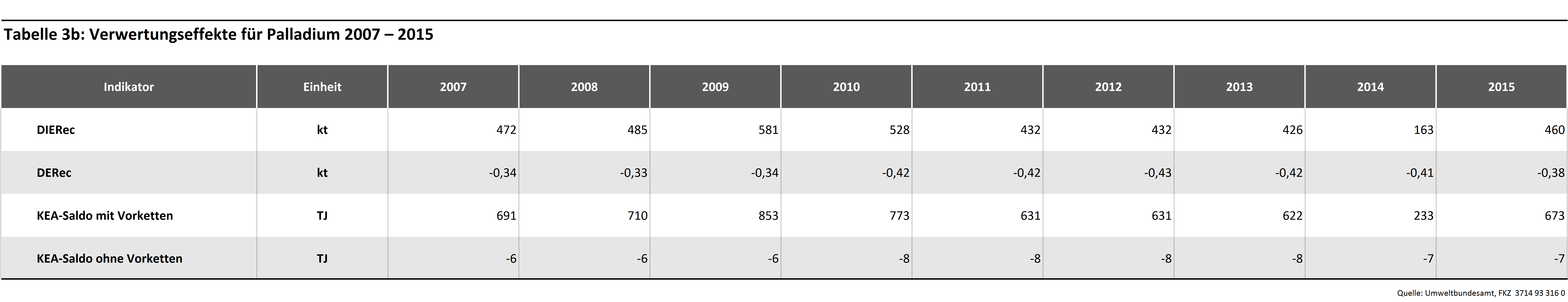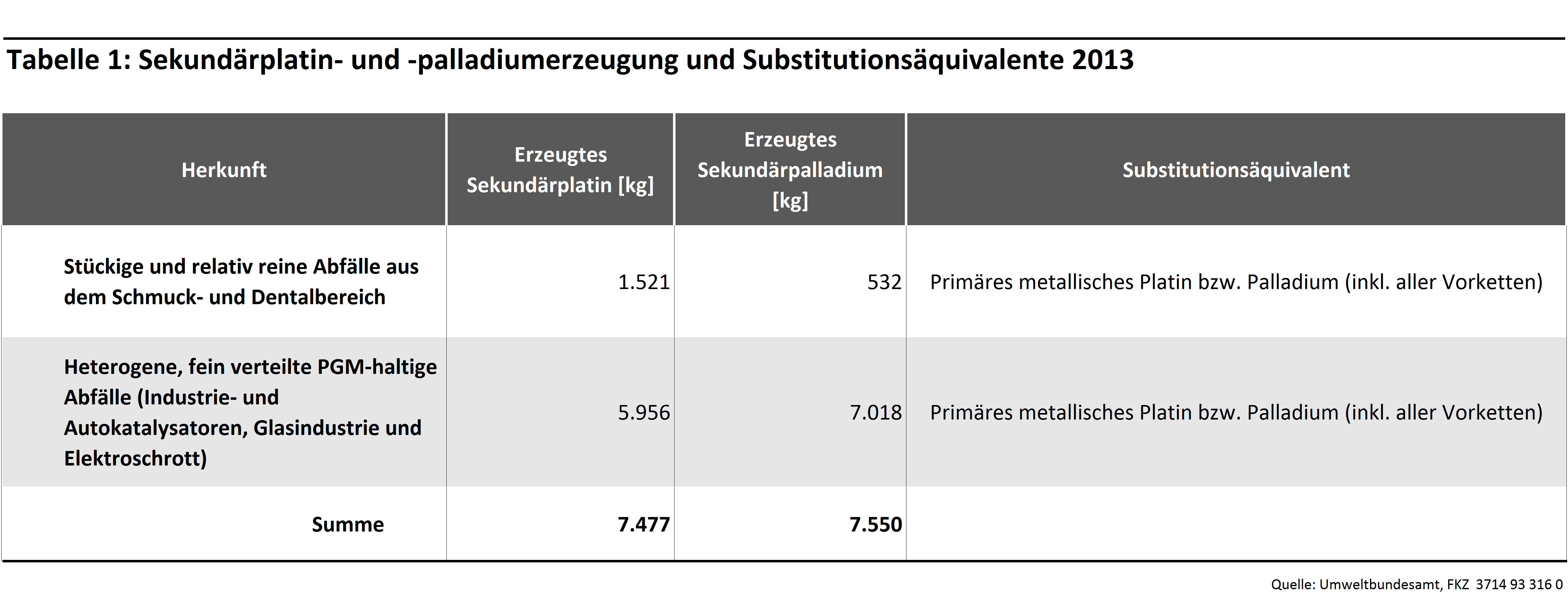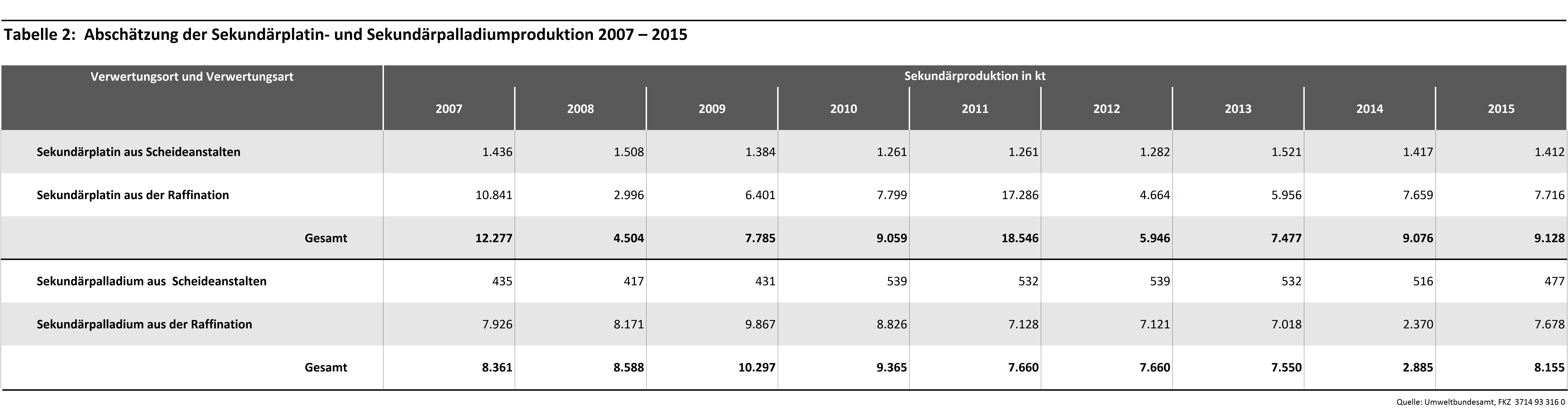 Die folgenden Tabellen geben die Sekundärerzeugnisse von Platin und Palladium in Deutschland aus inländischen Platin- und Palladiumschrotten, die zur Bilanzierung berücksichtigten Substitutionsäquivalente sowie eine Zeitreihe der angenommenen Verwertungsmengen wieder.