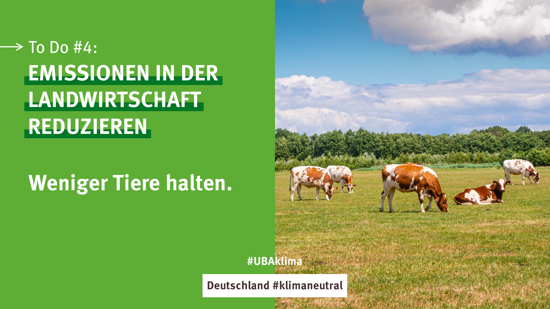 Weniger Tiere halten: So verursacht die Produktion von einem Kilo Rindfleisch zwischen sieben und 28 Kilo Treibhausgase, während Obst oder Gemüse bei weniger als einem Kilo liegen. Ein Vorschlag des UBA ist, tierische Lebensmittel mit 19 % zu besteuern, dafür aber den Steuersatz für pflanzliche Lebensmittel weiter zu verringern und diese damit günstiger zu machen. Weitere Maßnahmen in der Landwirtschaft sind, Stickstoffüberschüsse deutlich zu reduzieren und landwirtschaftlich genutzte Moorböden wieder zu vernässen, denn Moore sind hervorragende CO₂-Speicher. Mehr dazu: