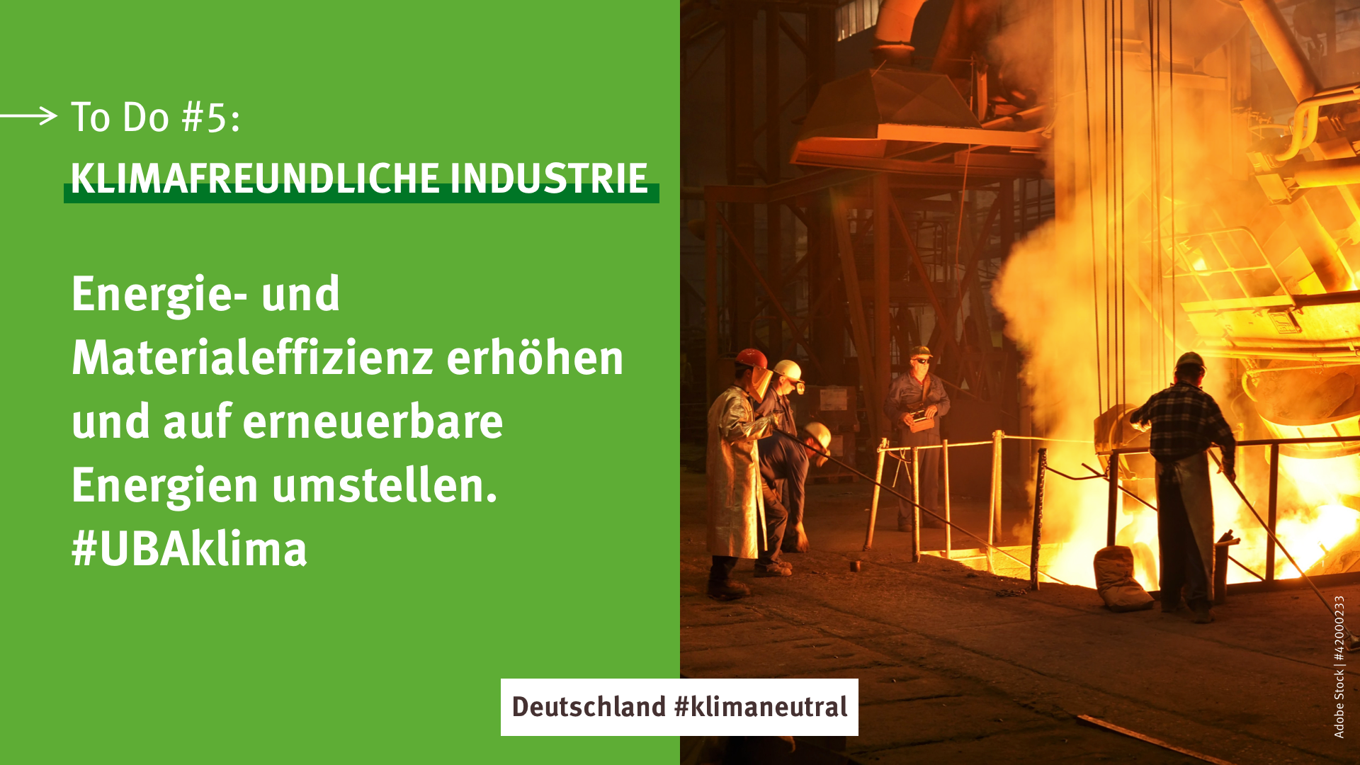 Energie- und Materialeffizienz erhöhen und auf erneuerbare Energien umstellen: In der Industrie muss an der Effizienz gearbeitet werden. Im Zentrum der Industriewende stehen also Energie- & Materialeinsparungen. Ziel: Innovationen in der Prozesstechnik, um erneuerbaren Strom direkt zu nutzen oder in Zukunft grünen Wasserstoff. Ein bedeutender Teil der Treibhausgas-Emissionen sind prozess- und rohstoffbedingt und schwierig zu vermeiden. THG-intensive Herstellungsprozesse für Grundstoffe und Halbzeuge in andere Teile der Welt zu verlagern, würde dem Umwelt- und speziell dem #Klimaschutz eher schaden als nutzen. Hier müssen also Prozesse komplett umgestellt werden. Das gilt zum Beispiel für die Stahlindustrie und die chemische Industrie. In einem treibhausgasneutralen Wirtschaftssystem können die Emissionen der Industrie bis auf etwa 5% der Aktuellen reduziert werden. Es verbleiben vornehmlich rohstoffbedingte Emissionen der Zement-, Kalk- und Glasindustrie – hier sind Nutzungsoptionen für das rohstoffbedingt freigesetzte CO2 zu entwickeln. Das UBA unterstützt diese Umstellung in der Industrie durch die fachliche Begleitung der BMU-Förderrichtlinie „Dekarbonisierung in der Industrie“. Mehr dazu: