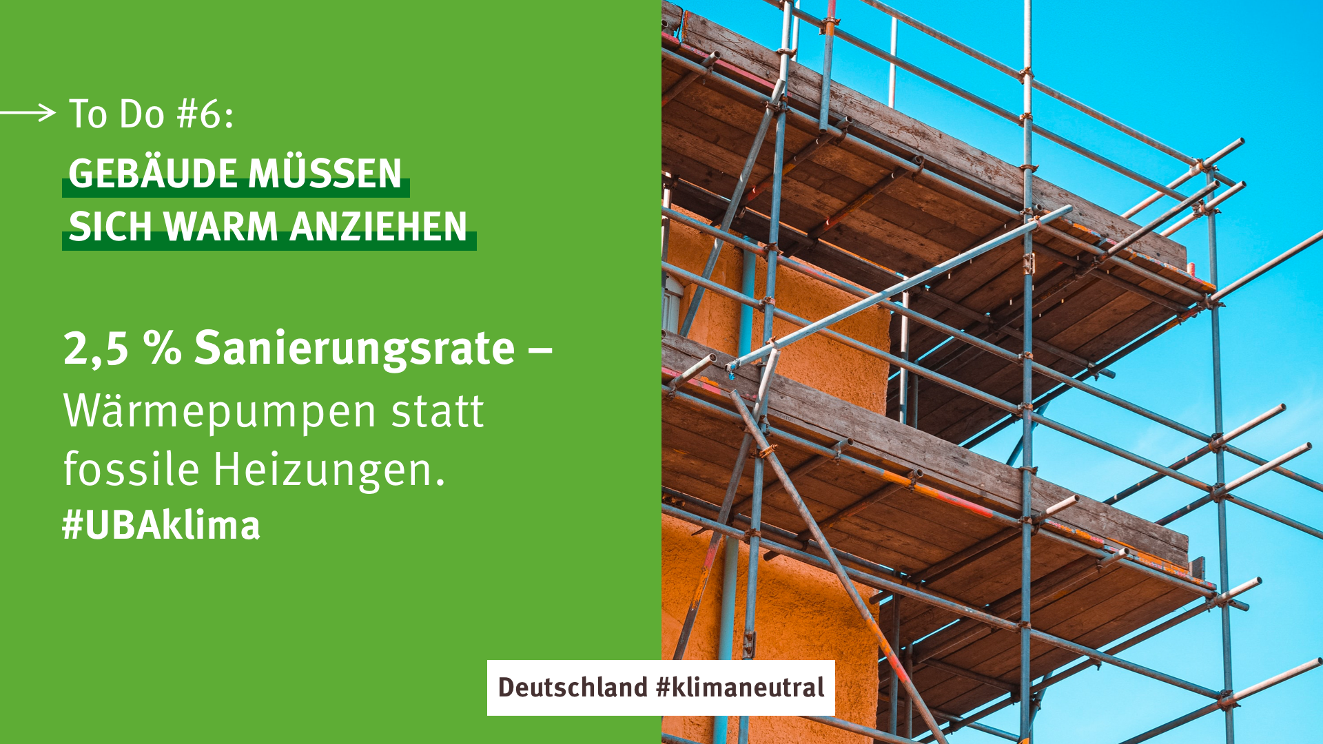 2,5% Sanierungsrate Wärmepumpen statt fossile Heizungen: Über 30% unserer Energie brauchen wir für Gebäude. Aber viel zu viel davon ist verschwendet, durch undichte Fenster, ungedämmte Wände & Dächer. Wir müssen viel mehr energetisch sanieren, 2,5 % des Gebäudebestandes pro Jahr! Aktuell sind wir nur bei 1 %. Und wir müssen die Wärmeversorgung komplett umstellen, von Öl- und Gasheizungen auf Wärmepumpen, die mit Strom aus erneuerbaren Energien angetrieben werden, und auf Wärmenetze. Mehr dazu: