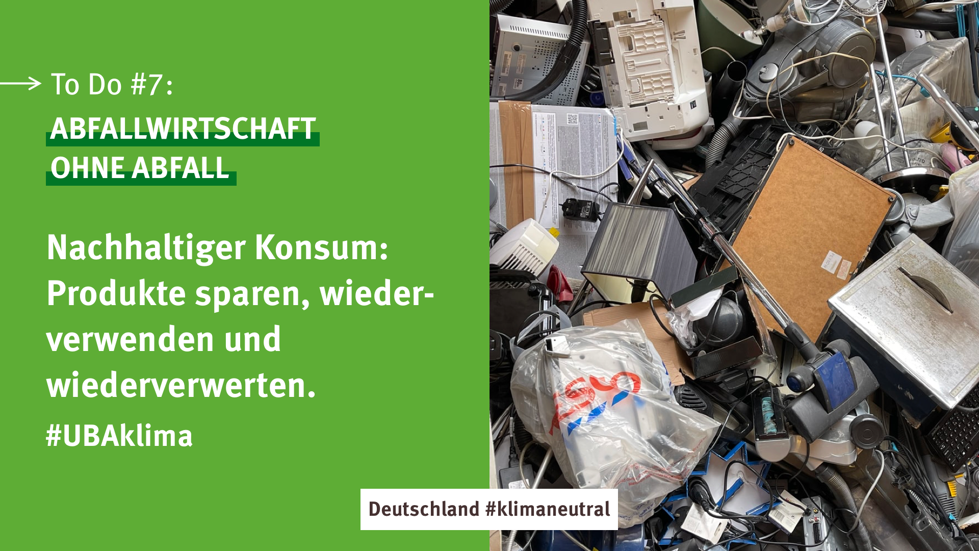 Nachhaltiger Konsum: Produkte sparen, wiederverwenden und ökologisch sinnvoll recyceln. Abfall gar nicht entstehen lassen! Die beste CO₂-Einsparung bringen Produkte, die gar nicht erst hergestellt werden. Weniger und dafür nachhaltiger Konsum ist wichtiger Bestandteil einer Kreislaufgesellschaft. Recycling spart die aufwändige Extraktion und Weiterverarbeitung von Primärrohstoffen – so wird viel CO₂ eingespart. Eine Kreislaufgesellschaft bedenkt das gesamte „Leben“ von Produkten und Materialien. Global & inklusive aller verbundener ökologischer und sozialer Auswirkungen. Produkte so lange wie möglich zu nutzen und zu reparieren, statt früh auszurangieren, schont Ressourcen und schützt das Klima. Dafür brauchen wir gutes Design – so veranstaltet das UBA z. B. den Bundespreis Ecodesign.