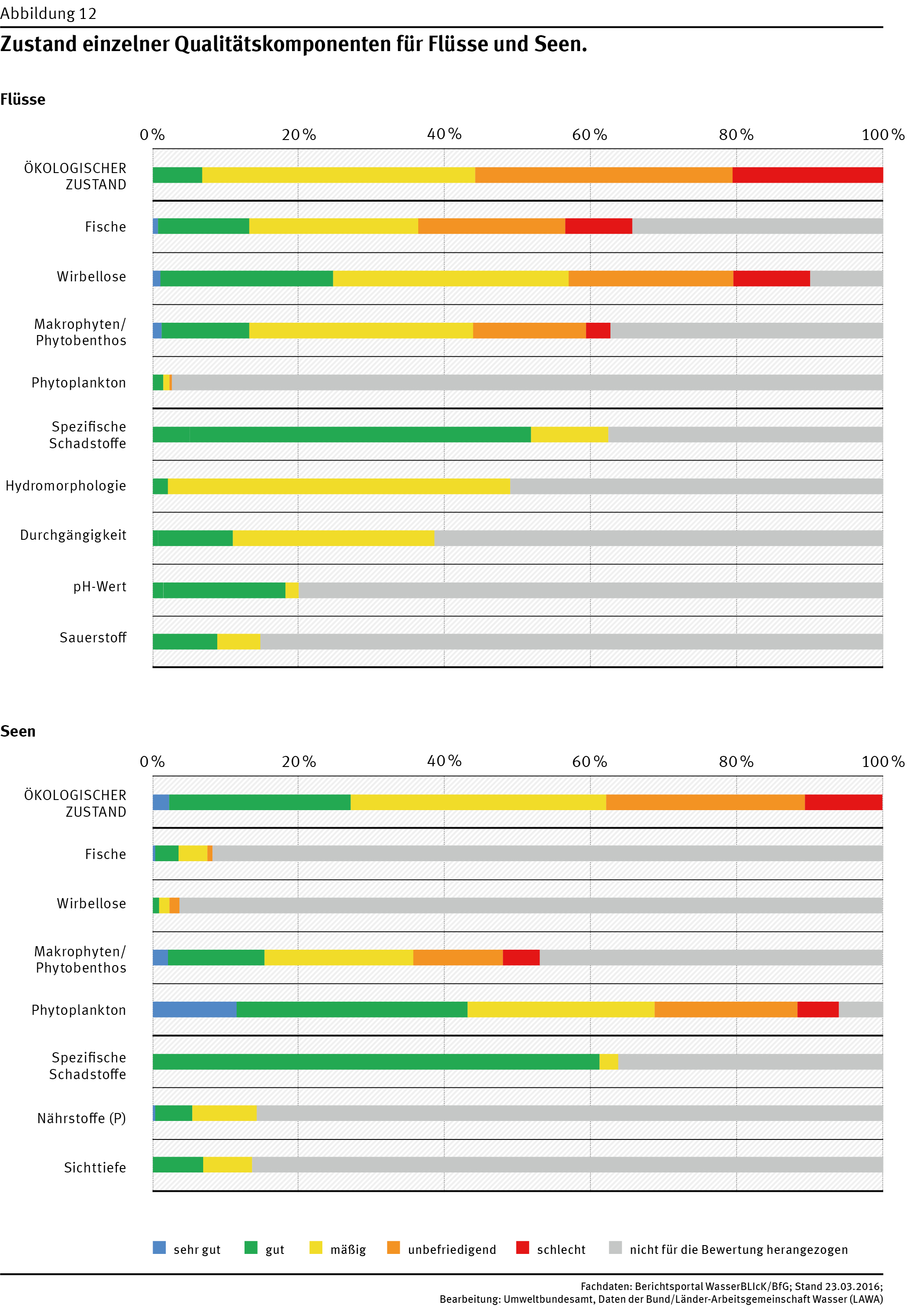 Die Ergebnisse zum chemischen Zustand der Flüsse sind zweigeteilt: 86 Prozent der Oberflächenwasserkörper (Flüsse und Seen) erreichen einen allgemein guten chemischen Zustand. Das bedeutet: die Flüsse weisen derzeit keine neuen Schadstoffbelastungen auf. Bezieht man jedoch Stoffe ein, die seit sehr langer Zeit die Umwelt belasten und quasi allgegenwärtig sind - z. B. Quecksilber aus der jahrhundertelangen Verbrennung von Kohle oder polyzyklische aromatische Kohlenwasserstoffe aus Weichmachern von Kunststoffen - fällt die Bewertung deutlich schlechter aus. Wegen dieser andauernden Belastungen ist kein „Oberflächenwasserkörper“, womit Seen, Flüsse, Flussmündungen und Küstengewässer gemeint sind, in einem guten chemischen Zustand. Die selbe Problematik trifft auch für viele Gewässer in anderen EU-Mitgliedsstaaten zu.