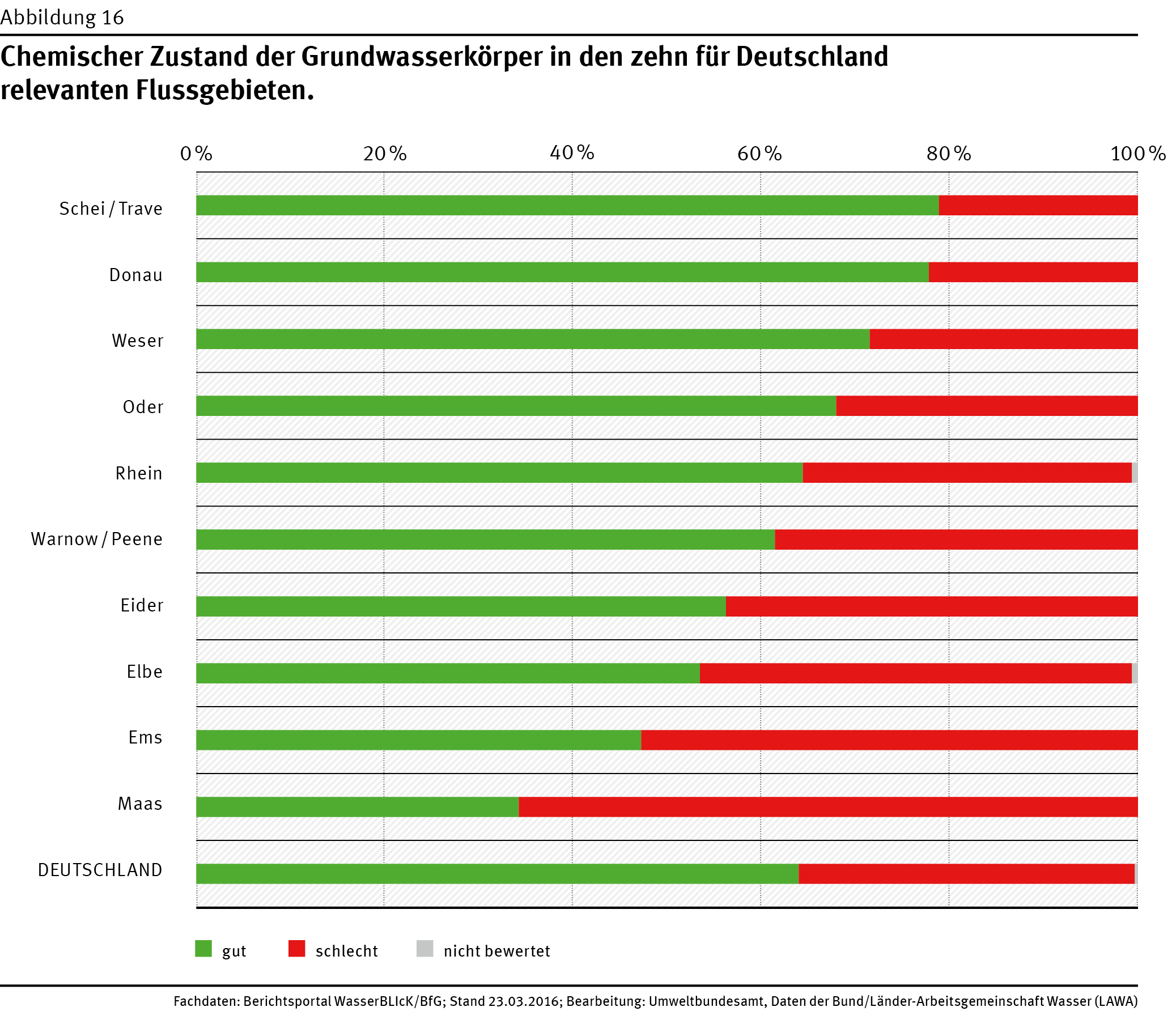 Beim Grundwasser erreichen 96 Prozent der Grundwasserkörper einen „guten mengenmäßigen Zustand“ und 64 Prozent einen „guten chemischen Zustand“. Dort, wo der der chemische Zustand als „schlecht“ bewertet wird, gibt es meistens zu hohe Nitratkonzentrationen. Maria Krautzberger, Präsidentin des Umweltbundesamtes (UBA): „Die zu hohen Nitrateinträge, die unser Grundwasser belasten, stammen überwiegend aus der Landwirtschaft. Diese muss ihrer Verantwortung für sauberes Wasser gerecht werden. Wir brauchen daher dringend bessere rechtliche Vorgaben zur Düngung, um unser Grundwasser wirksam zu schützen.“ Wichtig wären beispielsweise die obligatorische Einführung einer betrieblichen Gesamtnährstoffbilanzierung und ein verbesserter Vollzug der zu novellierenden Düngeverordnung.