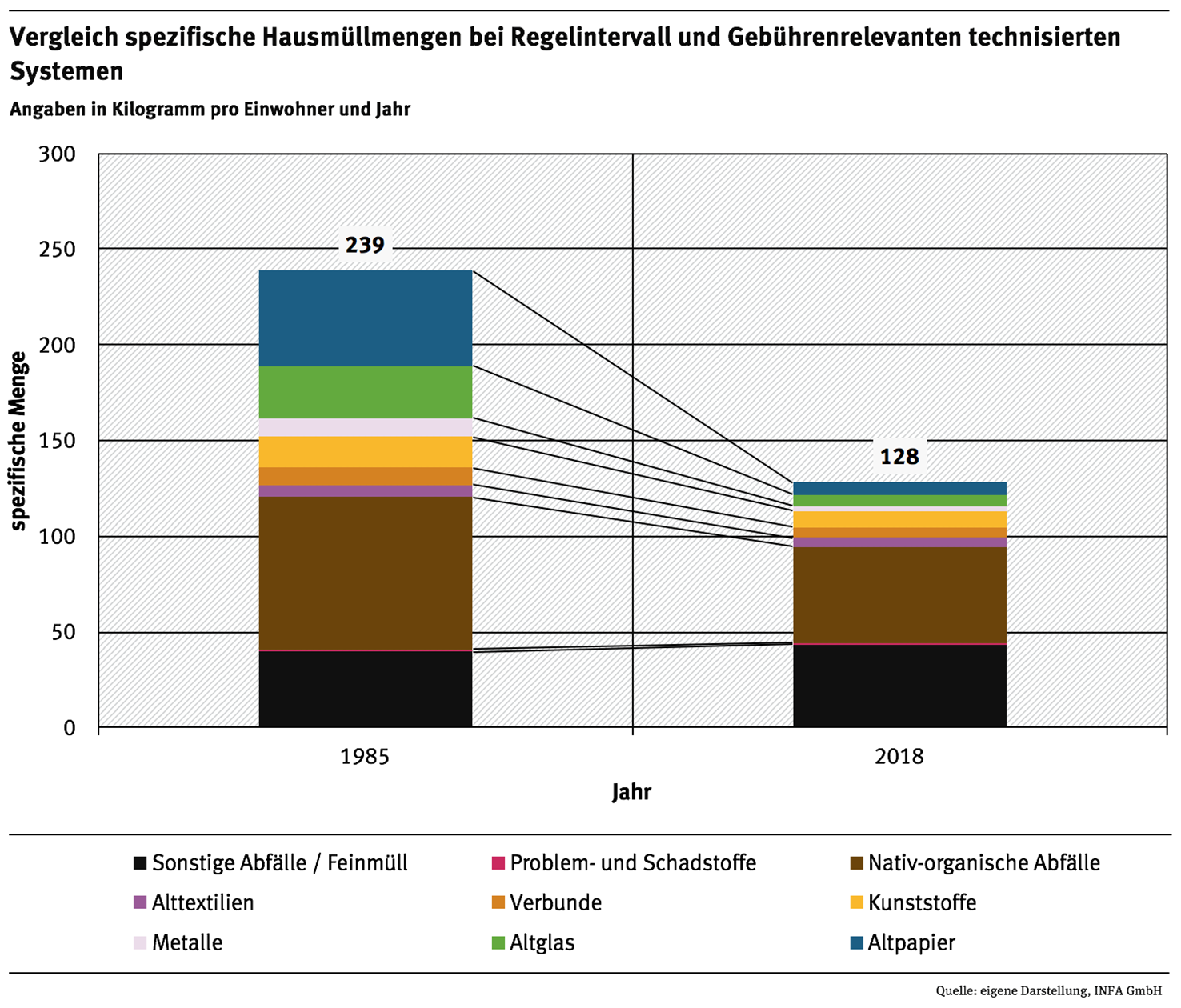 Insgesamt fielen im Jahr 2018 in Deutschland 128 Kilogramm Restmüll pro Einwohner und Jahr an. Das ist ein Rückgang von rund 46 Prozent im Vergleich zu 1985 (239 Kilogramm Restmüll pro Einwohner und Jahr). Altpapier, Altglas, Metalle und Kunststoffen landen deutlich seltener in der Restmülltonne als damals, hier sind Rückgänge von bis zu 80 Prozent zu verzeichnen.