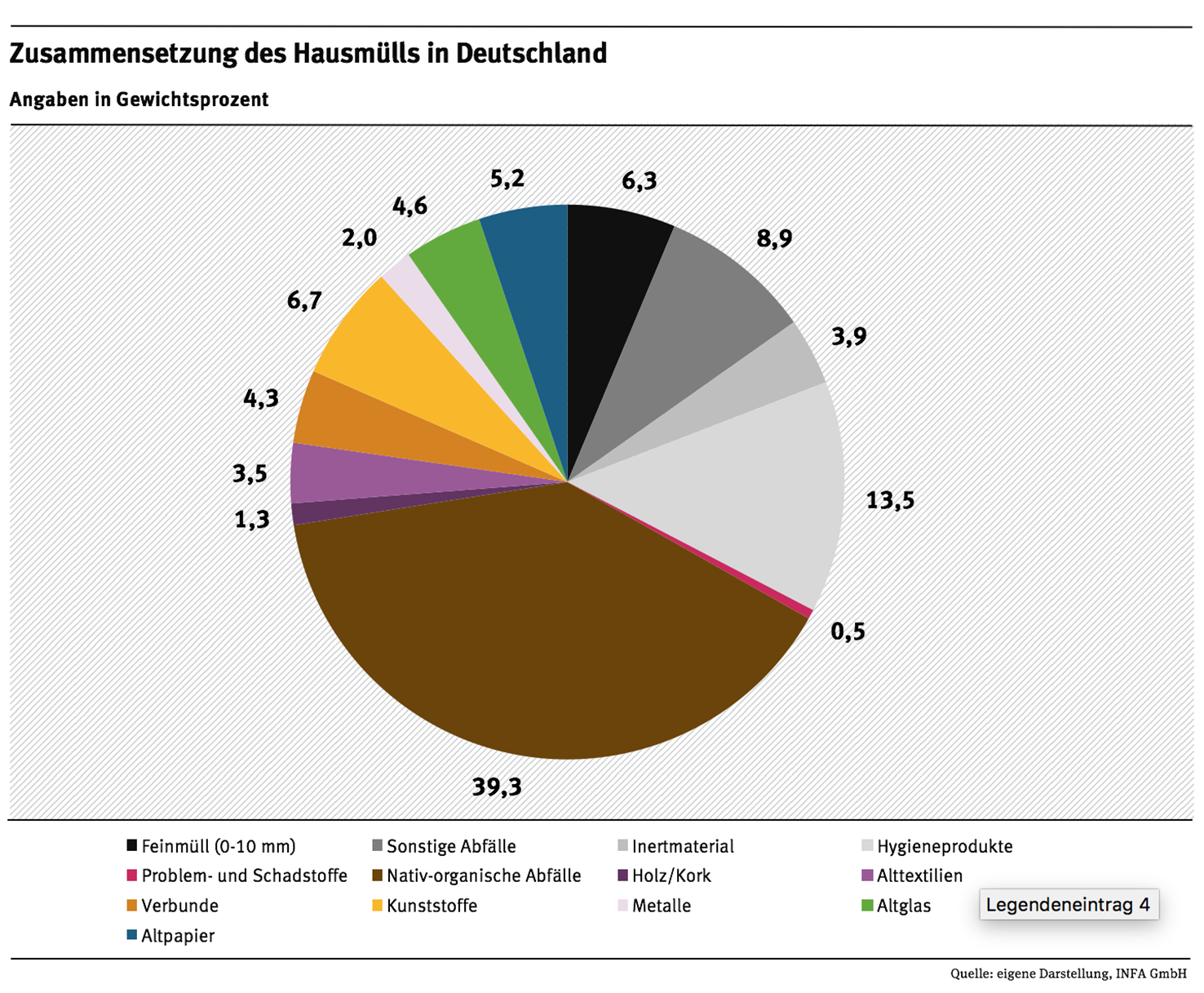 Ein Drittel aller Bioabfälle werden noch immer über den Hausmüll entsorgt. Mit rund 39 Prozent besteht der größte Teil des Restmülltonneninhalts aus Bioabfällen. Dazu gehören Küchen- und Nahrungsabfälle, Gartenabfälle, sonstige organische Abfälle wie Kleintierstreu aus Stroh/Heu sowie gefüllte oder teilentleerte Lebensmittelverpackungen. Die wichtigsten Bioabfälle in Hinblick auf eine Verwertung sind die Nahrungs-, Küchen- und Gartenabfälle mit einer jährlichen Menge von rund drei Millionen Tonnen.