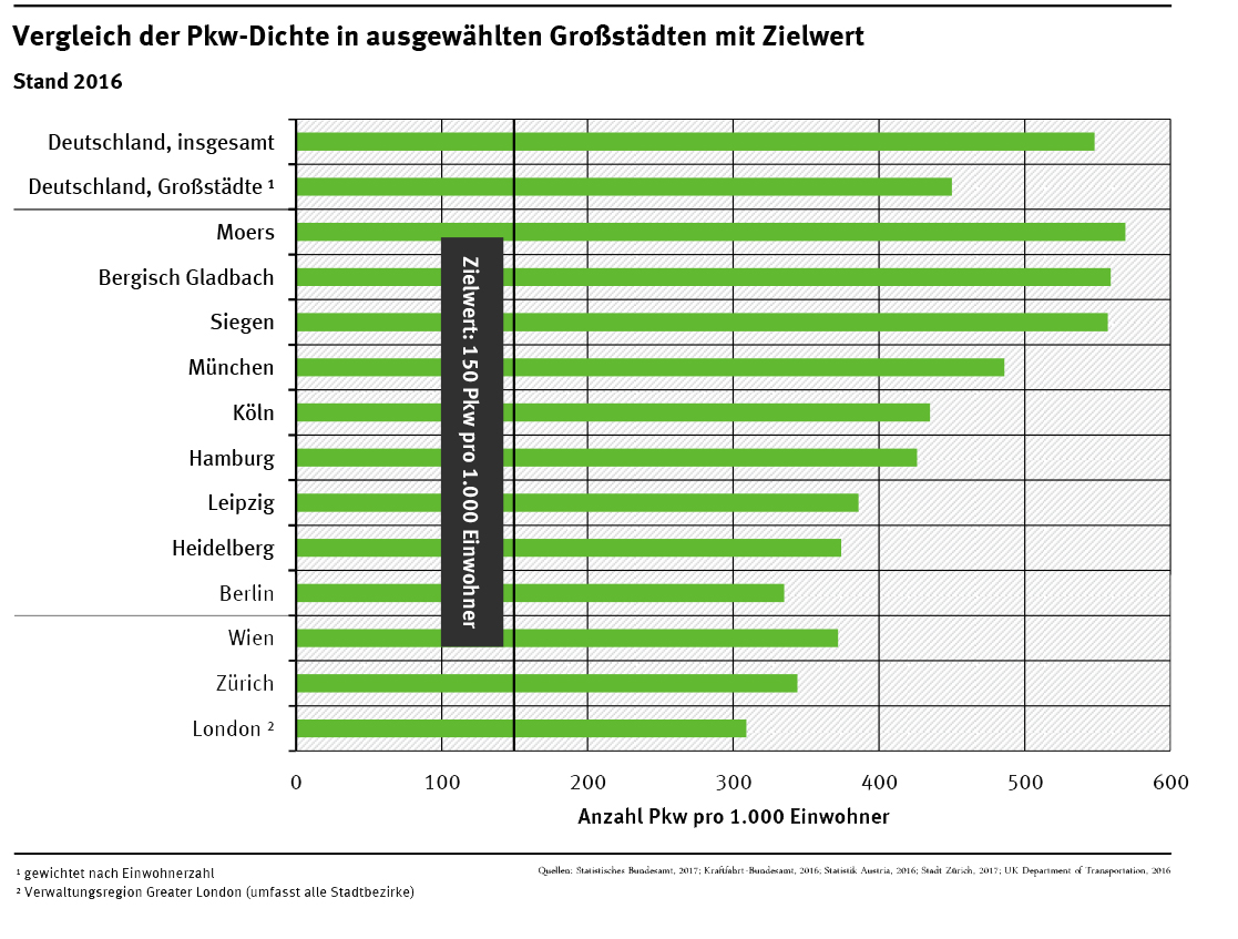 Die Analyse des UBA zeigt außerdem: Städte mit mehr als 100.000 Einwohnern benötigen nicht mehr als 150 Fahrzeuge pro 1.000 Einwohner, um eine uneingeschränkte Mobilität anzubieten. Diese wären als Carsharing-Fahrzeuge unterwegs und könnten jederzeit von den Bürgerinnen und Bürgern genutzt werden. Bei weniger als 150 Pkw brauchen die Fahrzeuge auch nahezu keine öffentlichen Stellplätze mehr. Straßen und Parkplätze würden nach und nach zu Grün- und Aufenthaltsflächen oder zu Bauland, um innerstädtisch Wohnraum zu schaffen. Zudem bekäme der Radverkehr mehr Raum und es entsteht mehr Platz für den Ausbau des ÖPNV. In deutschen Großstädten mit über 100.000 Einwohnern gibt es derzeit im Schnitt etwa 450 Pkw pro 1.000 Einwohner.