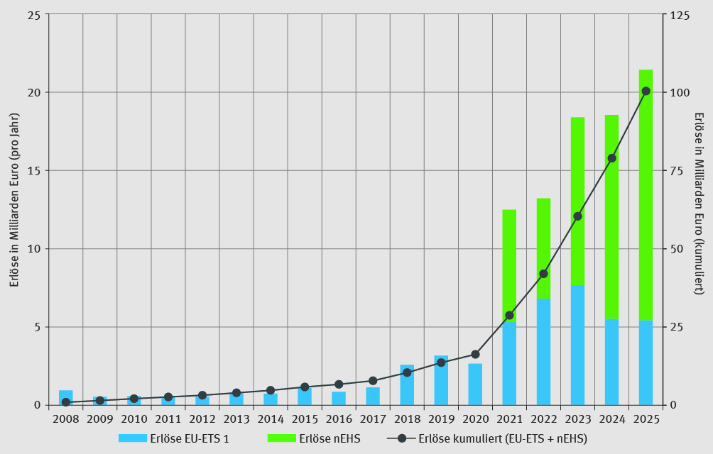 Infolge des nahezu unveränderten Umfangs veräußerter nEHS-Zertifikate im Jahr 2025 und des von 45 auf 55 Euro gestiegenen Festpreises konnten deutlich höhere Einnahmen verzeichnet werden (2024: 295 Millionen nEZ mit den Jahreskennungen 2024 und 2023 im Gesamtwert von rund 13 Milliarden Euro). 2026 werden nEZ erstmals in einem Preiskorridor mit einem Mindestpreis von 55 Euro und einem Höchstpreis von 65 Euro versteigert. Ab 2028 wird der nEHS durch den bereits 2023 beschlossenen Europäischen Emissionshandel für Brennstoffe (EU-ETS 2) größtenteils abgelöst werden.