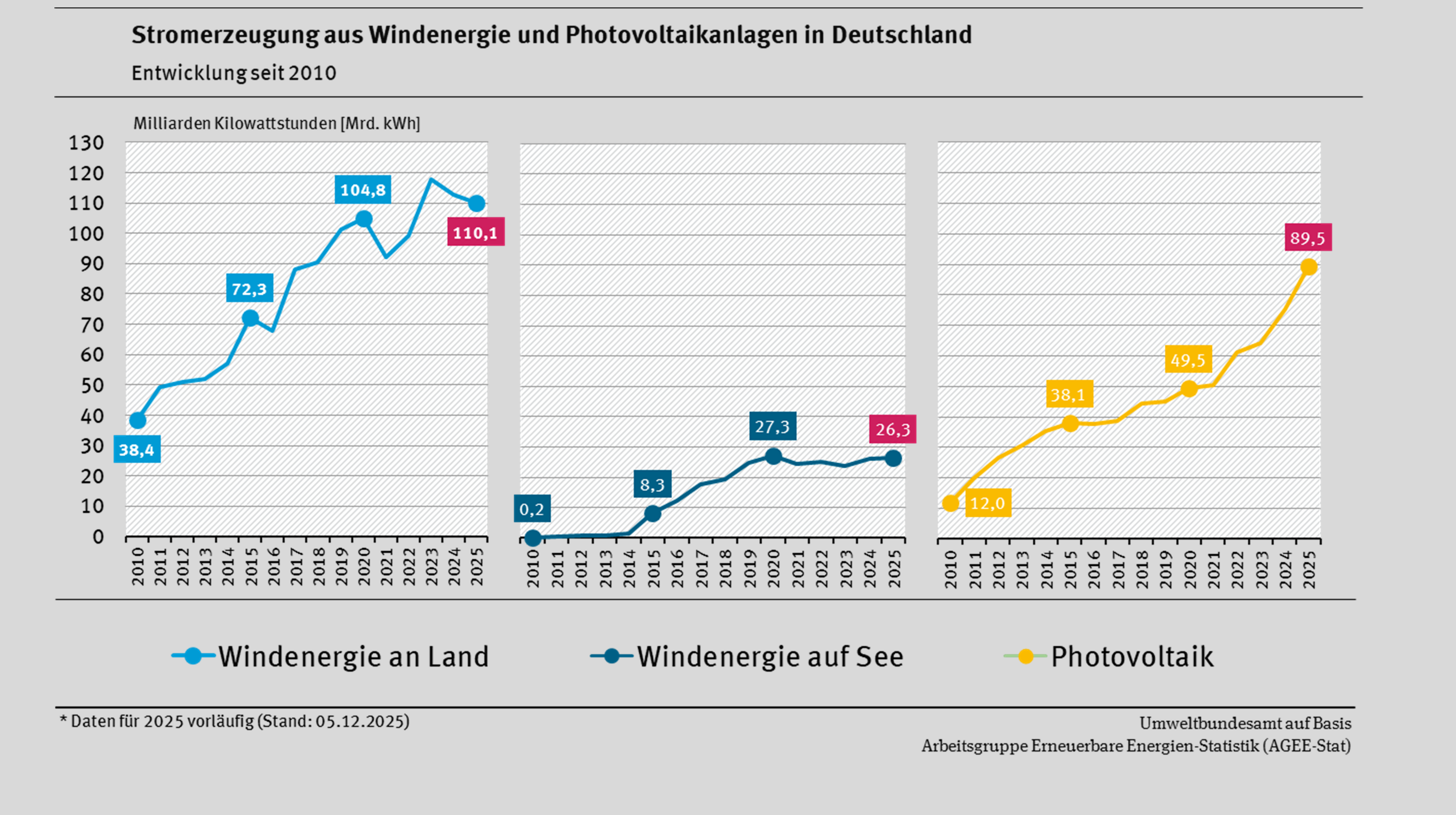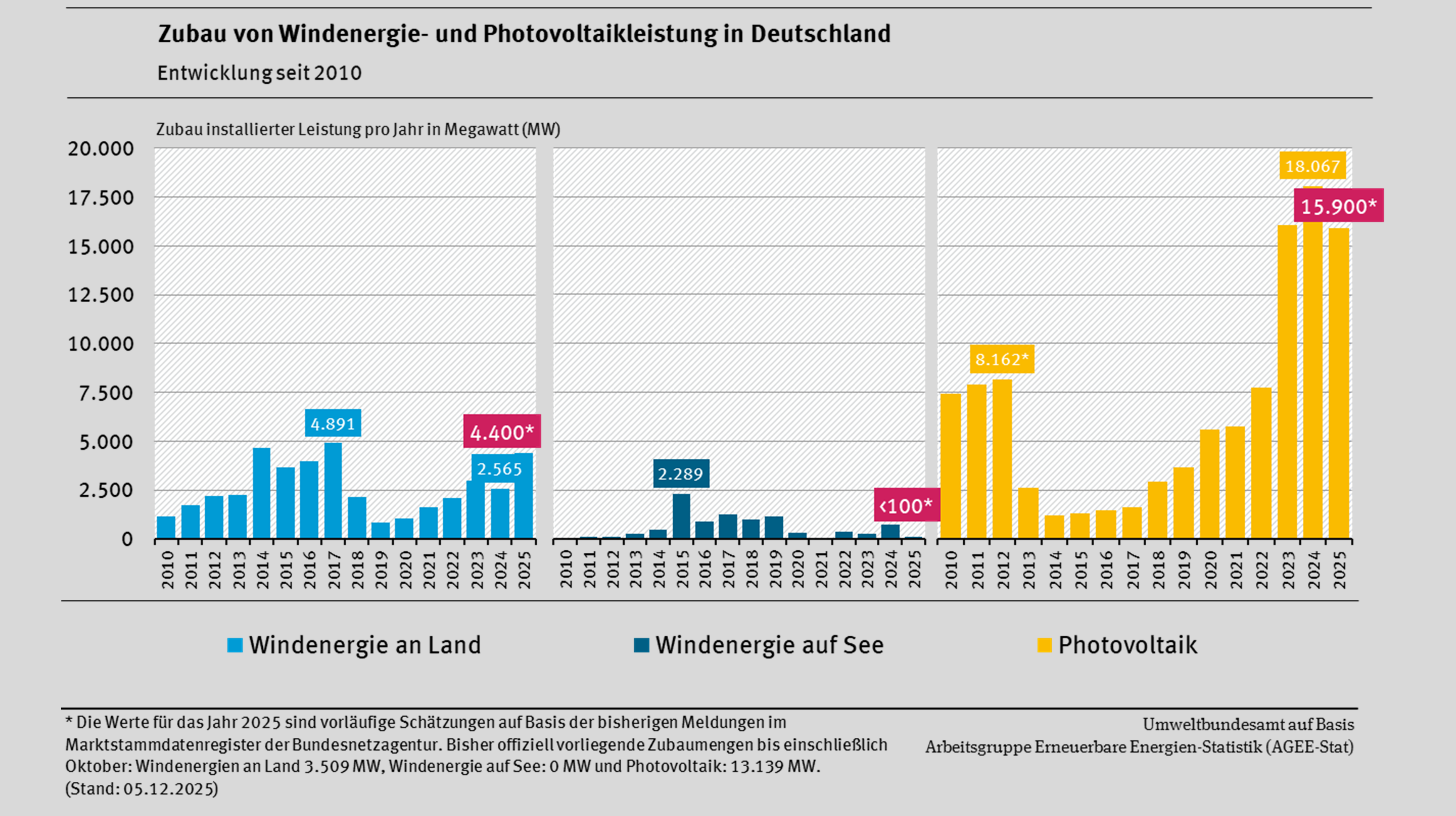 Die Arbeitsgruppe Erneuerbare Energien-Statistik (AGEE-Stat) bilanziert im Auftrag des Bundesministeriums für Wirtschaft und Energie (BMWE) die Nutzung der erneuerbaren Energien. Sie hat auf der Grundlage aktuell verfügbarer Daten eine erste Schätzung zur Entwicklung der erneuerbaren Energien im Strom-, Wärme- und Verkehrssektor in 2025 erstellt. In den Bereichen Wärme und Verkehr sind die bisher vorliegenden Daten noch mit Unsicherheiten behaftet. Im März 2026 wird das jährliche AGEE-Stat-Hintergrundpapier „Erneuerbare Energien in Deutschland – Daten zur Entwicklung im Jahr 2025“ erscheinen. Mit dem Hintergrundpapier werden konsolidierte Daten für die Bereiche Strom, Wärme und Verkehr veröffentlicht und vertiefende Einschätzungen zur Entwicklung gegeben.