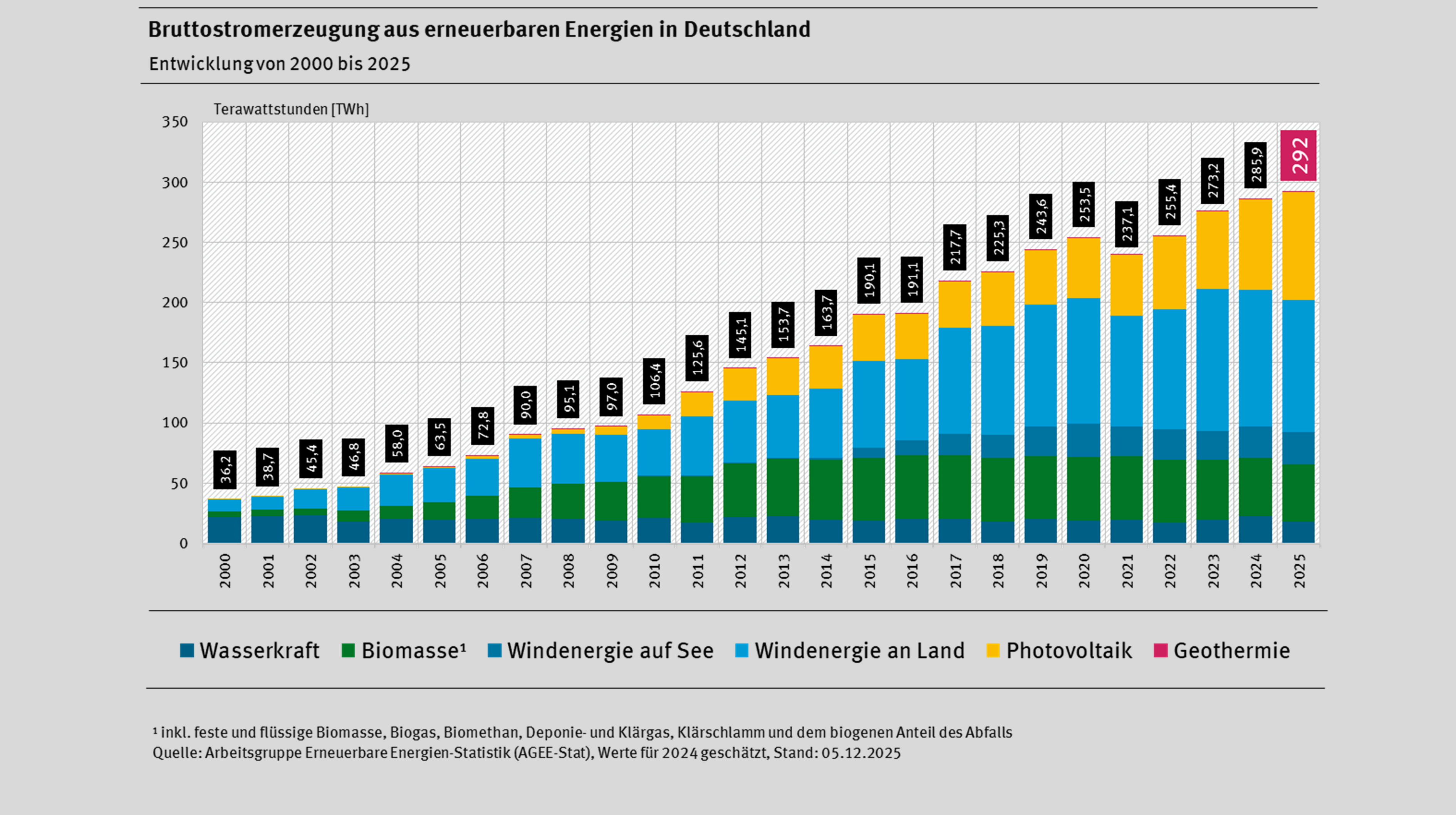 Die deutsche Bruttostromerzeugung aus erneuerbaren Energien wird 2025 mit voraussichtlich 292 Terawattstunden (TWh) etwa 2 Prozent über der Erzeugung des Vorjahres liegen. Das teilte die Geschäftsstelle der Arbeitsgruppe Erneuerbare Energien-Statistik (AGEE-Stat) am Umweltbundesamt (UBA) heute mit. Der Anteil erneuerbarer Energien am wieder anziehenden Bruttostromverbrauch steigt damit leicht auf rund 55 Prozent. In den letzten Jahren lag der Anteil bei 54,1 Prozent (2024) und 52,5 Prozent (2023).