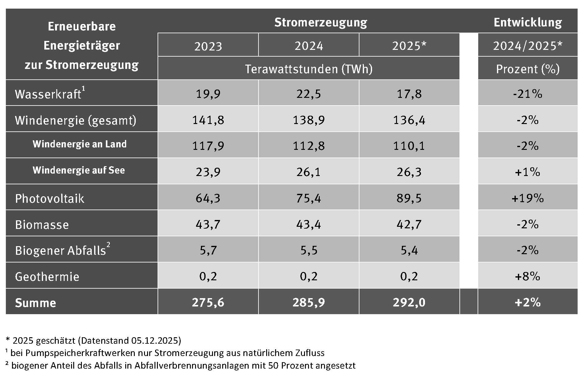 Tabelle Entwicklung der Stromerzeugung aus Erneuerbaren Energieträgern 2025