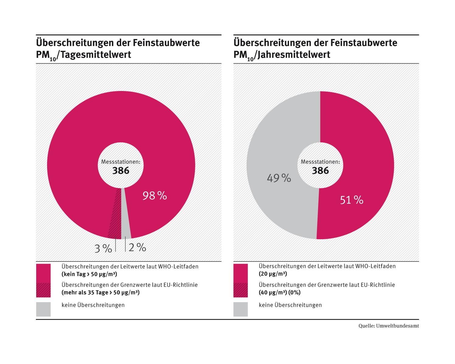 Von 386 Messstationen überschreiten 3% den EU-Grenzwert, 98% den WHO-Leitwert und 2% haben keine Überschreitungen bei den Feinstaubwerten PM10/Tagesmittelwert. Beim PM10/Jahresmittelwert überschreiten 51% den WHO-Leitwert; 49% haben keine Überschreitungen