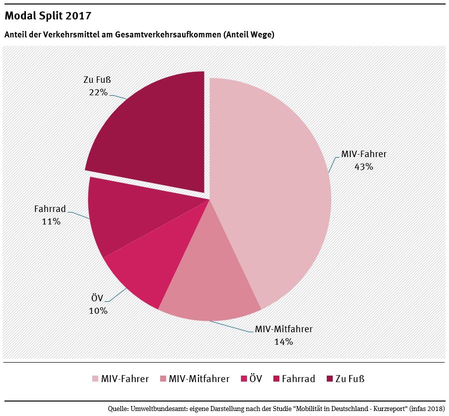 Als konkrete Zielvorgabe auf Bundesebene für 2030 wäre die Steigerung des Fußverkehrsanteils an den Wegen der Deutschen um die Hälfte sinnvoll: von derzeit durchschnittlich 27 Prozent in Kernstädten auf 41 Prozent und von durchschnittlich 23 Prozent in ländlichen Kreisen auf 35 Prozent bis 2030.