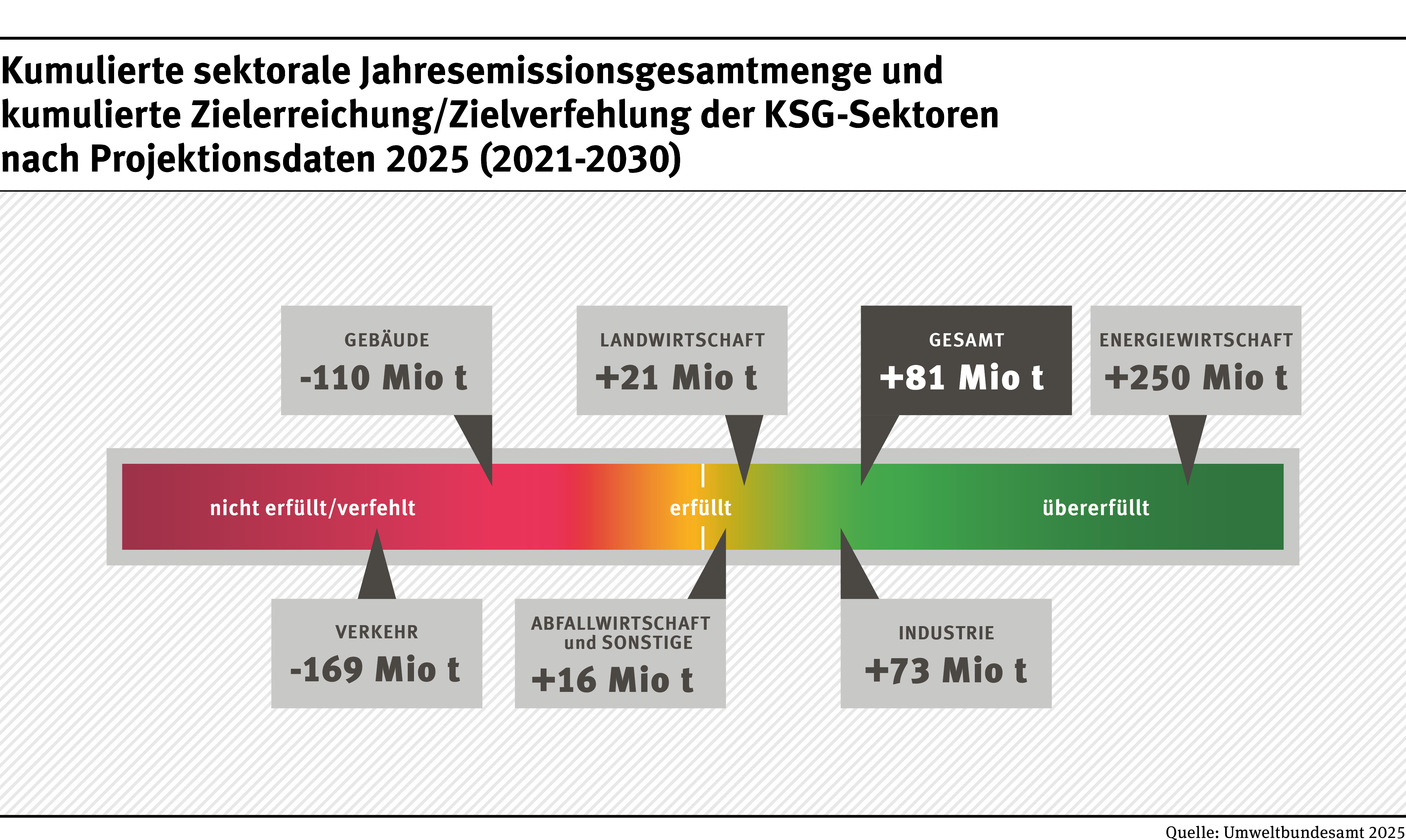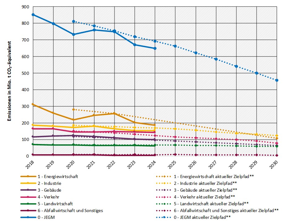 Die gesetzlich erlaubte, angepasste Jahresemissionsgesamtmenge von 693,4 Millionen Tonnen CO2-Äquivalenten (Mio. t CO2-Äq.) wird 2024 recht deutlich unterschritten. Die UBA-Projektionsdaten 2025 zeigen zudem, dass das Ziel, die THG-Emissionen bis 2030 um 65 Prozent gegenüber 1990 zu mindern, mit den schon implementierten klimapolitischen Instrumenten weiter in greifbarer Nähe ist – vorausgesetzt, dass diese weiterhin konsequent umgesetzt werden. Bis 2030 würden die Treibhausgasemissionen um 63 Prozent gemindert. Im Zeitraum 2021 bis 2030 werde die sektorübergreifende Jahresemissionsgesamtmenge sogar mit 81 Mio. t CO2-Äq. übererfüllt werden. Das gelingt aber nur, weil durch die fortschreitende Energiewende die Emissionen in der Energieerzeugung überproportional sinken und so die Zielverfehlungen der Sektoren Verkehr und Gebäude nach Klimaschutzgesetz (KSG) ausgleichen.