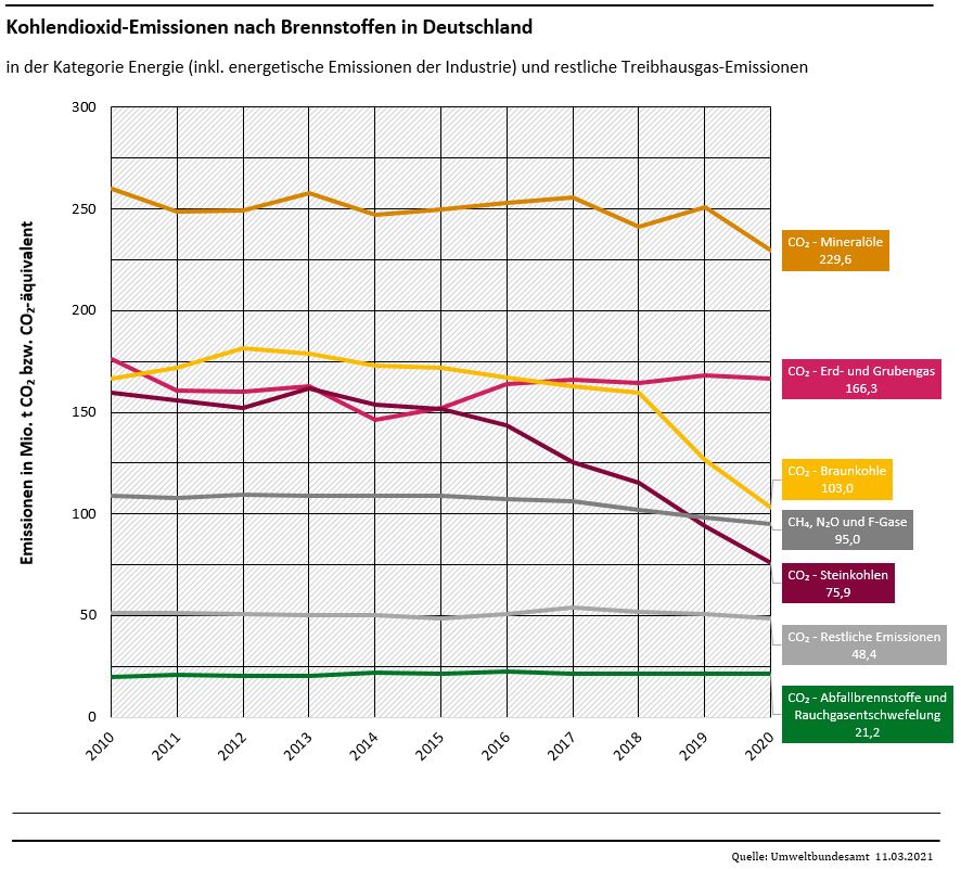 Im Ergebnis gingen bei allen Treibhausgasen 2020 die Emissionen zurück. Beim dominierenden Kohlendioxid beträgt der Rückgang knapp 67 Mio. Tonnen (-9,4 Prozent). Die Methangesamtemissionen gingen um gut 1 Mio. Tonnen CO2-Äquivalente (-2,1 Prozent) zurück. Die Lachgasemissionen gingen ebenfalls um gut 1 Mio. Tonnen CO2-Äquivalente zurück (-3 Prozent). Die Emissionen von fluorierten Treibhausgasen gingen 2020 aufgrund sinkender Bestands- und Befüllungsemissionen um 1,3 Mio. Tonnen CO2-Äquivalente (-9 Prozent) weiter zurück.
