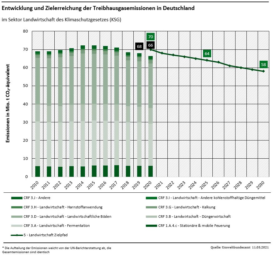 Im Sektor Landwirtschaft gingen die Treibhausgasemissionen um gut 1,5 Mio. Tonnen CO2-Äquivalente (minus 2,2 Prozent) auf 66 Mio. Tonnen CO2-Äquivalente zurück. Der Sektor bleibt damit unter der für 2020 im Klimaschutzgesetz festgelegten Jahresemissionsmenge von 70 Mio. Tonnen CO2-Äquivalenten. Gründe dafür sind ein vergleichsweise geringer Einsatz von Mineraldünger, sinkende Rinderbestände und die erneut trockene Witterung.