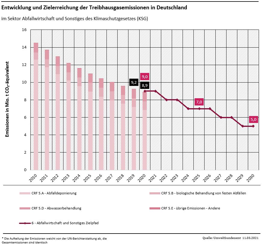 Die Emissionen des Abfallsektors sanken gegenüber dem Vorjahr um rund 3,8 Prozent auf knapp neun Mio. Tonnen CO2-Äquivalente. Damit bleibt der Abfallsektor unter der im Bundesklimaschutzgesetz festgelegten Jahresemissionsmenge von neun Mio. Tonnen CO2-Äquivalenten. Der Trend wird im Wesentlichen durch die sinkenden Emissionen der Abfalldeponierung bestimmt.