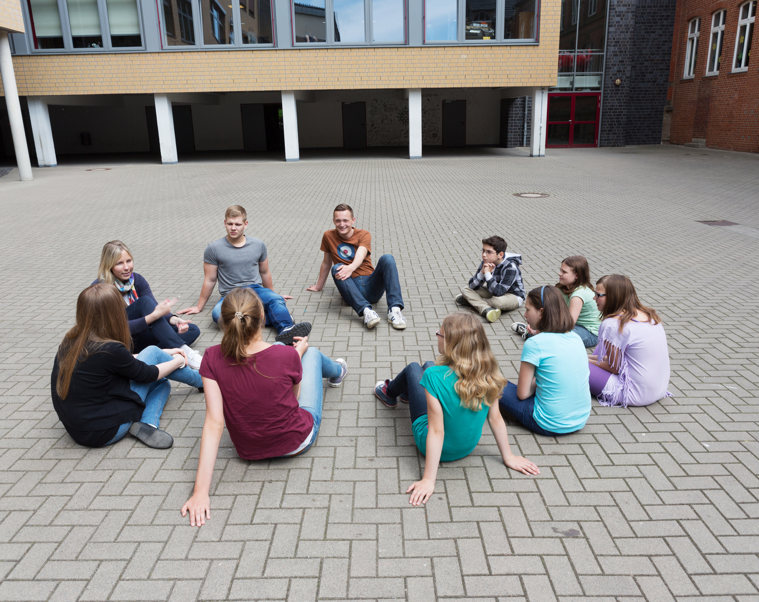 Auf dem Bild sind Jugendliche zusehen, die in einem Kreis auf dem Schulhof sitzen.
