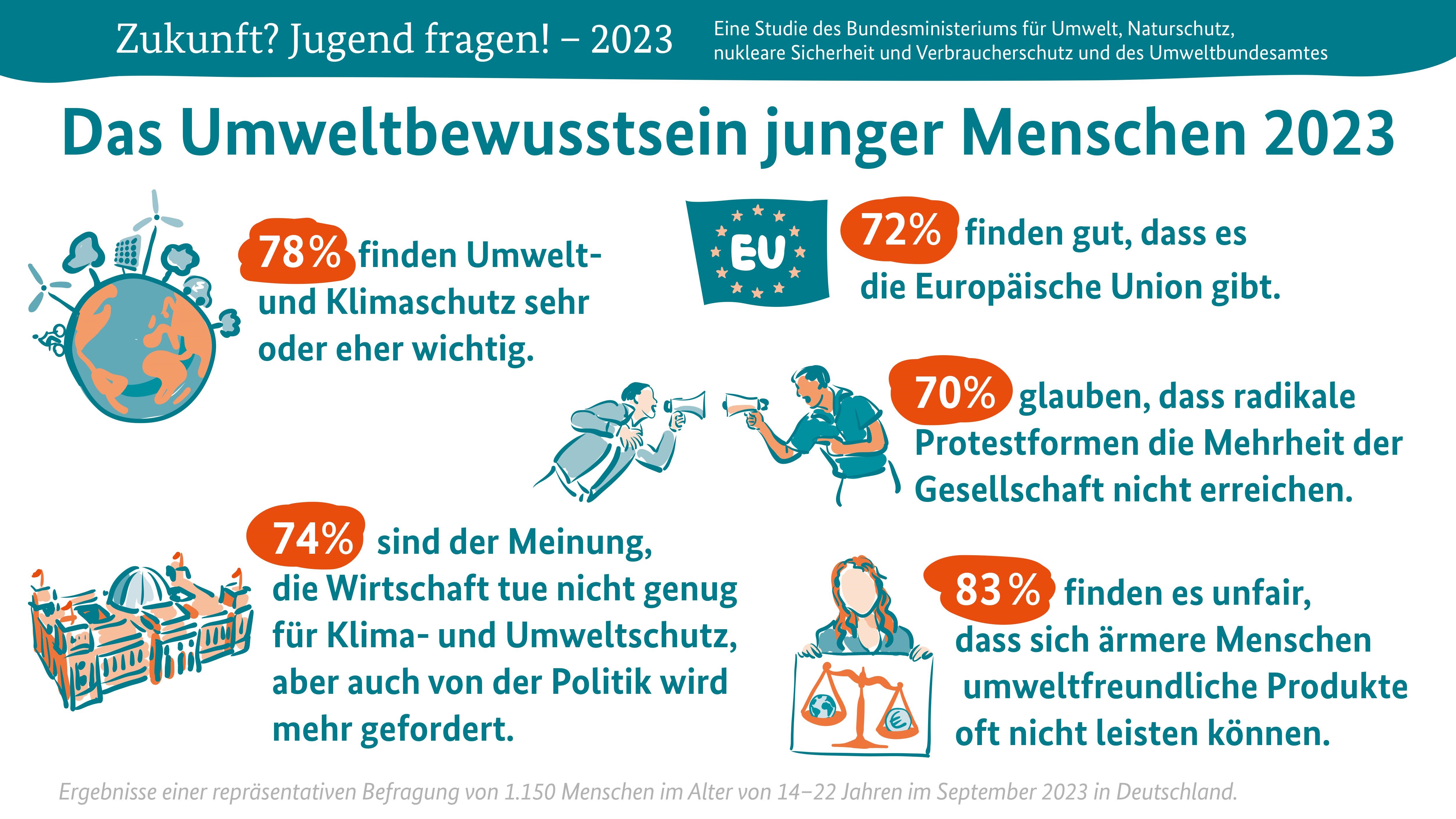 Infografik zu den Ergebnissen einer Studie des Bundesumweltministeriums und Umweltbundesamtes. 78 % der jungen Menschen finden Umwelt- und Klimaschutz sehr oder eher wichtig. Das Umweltbewusstsein junger Menschen 2023