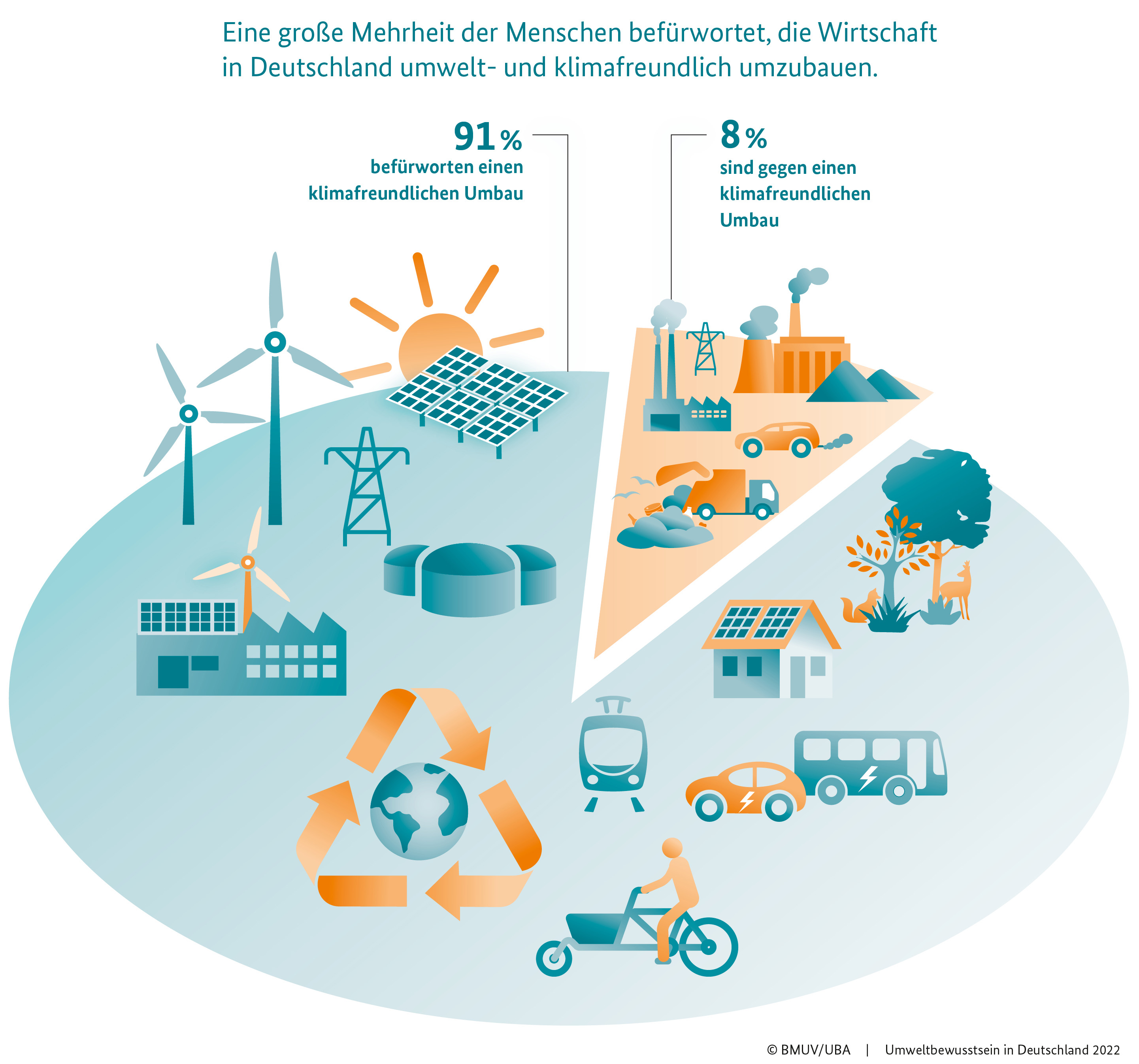 Beim Schwerpunktthema der Studie, dem umwelt- und klimafreundlichen Umbau der deutschen Wirtschaft, zeigt sich, dass eine überwältigende Mehrheit von 91 Prozent der Befragten dieses Ziel unterstützt. Dazu sagt UBA-Präsident Dirk Messner: „Es ist enorm wichtig, dass eine so deutliche Mehrheit den ökologischen Wirtschaftsumbau grundsätzlich befürwortet. Die Dekarbonisierung der Wirtschaft ist unerlässlich, wenn wir die Klimaschutzziele einhalten und unseren Beitrag dazu leisten wollen, einen gefährlichen Klimawandel jenseits der Zwei-Grad-Grenze zu verhindern."