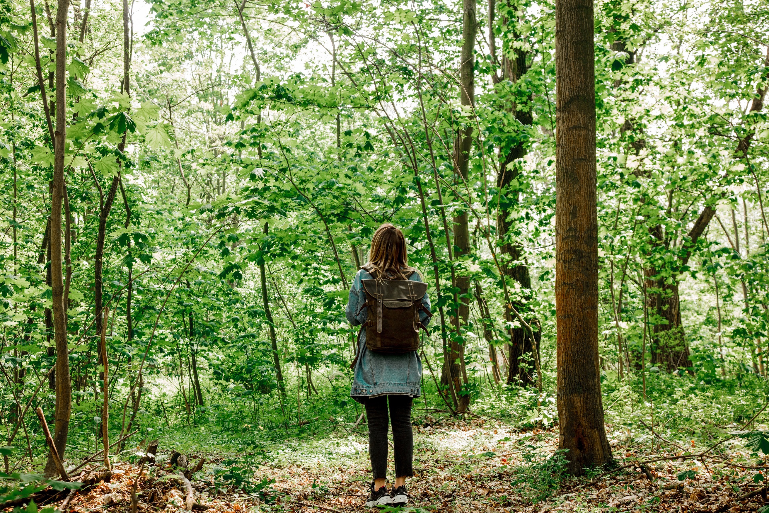 Zu sehen ist eine Frau, die mit dem Rücken zum Bild steht. Sie steht in einem Wald, der schön begrünt ist und guckt in die Weite.