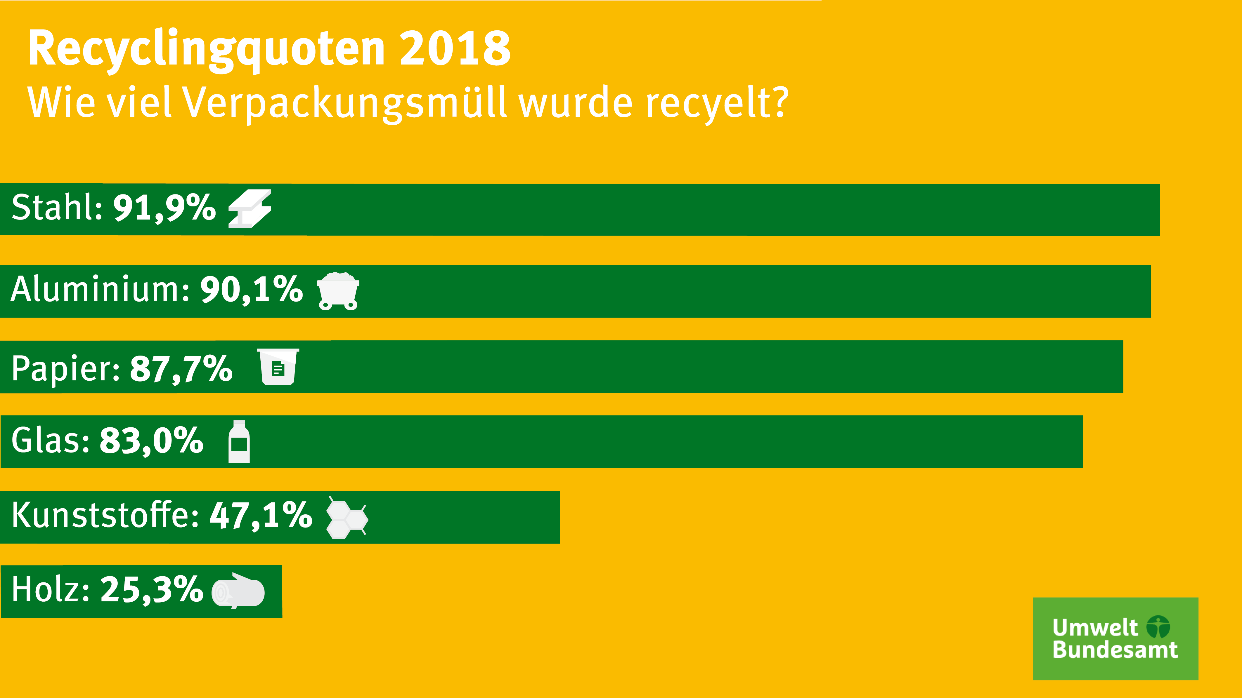 Folgende Verpackungen werden beim Gesamtverbrauch berücksichtigt: Verkaufs-, Um-, Transport-, Mehrwegverpackungen, Verpackungen schadstoffhaltiger Füllgüter und Einwegbestandteile der Mehrwegverpackungen. Die angegebenen Recyclingquoten für das Gesamtaufkommen beziehen sich auf alle in Deutschland angefallenen Verpackungsabfälle, die innerhalb Deutschlands oder in einem anderen Staat stofflich verwertet wurden. Davon zu unterscheiden sind die im Verpackungsgesetz festgelegten Quoten, welche von den dualen Systemen für die beteiligungspflichtigen Verpackungen mindestens erreicht werden müssen. Das sind diejenigen mit Ware befüllten Verkaufs- und Umverpackungen, die nach Gebrauch typischerweise bei privaten Endverbrauchern als Abfall anfallen. Diese Recyclingquoten des Verpackungsgesetzes werden nicht im Verhältnis zum Aufkommen der Verpackungsabfälle, sondern im Verhältnis zu den Beteiligungsmengen und der gesammelten Menge aus der Leichtverpackungssammlung bestimmt. Informationen zu Erfüllung dieser Quoten werden zu einem späteren Zeitpunkt gesondert veröffentlicht.