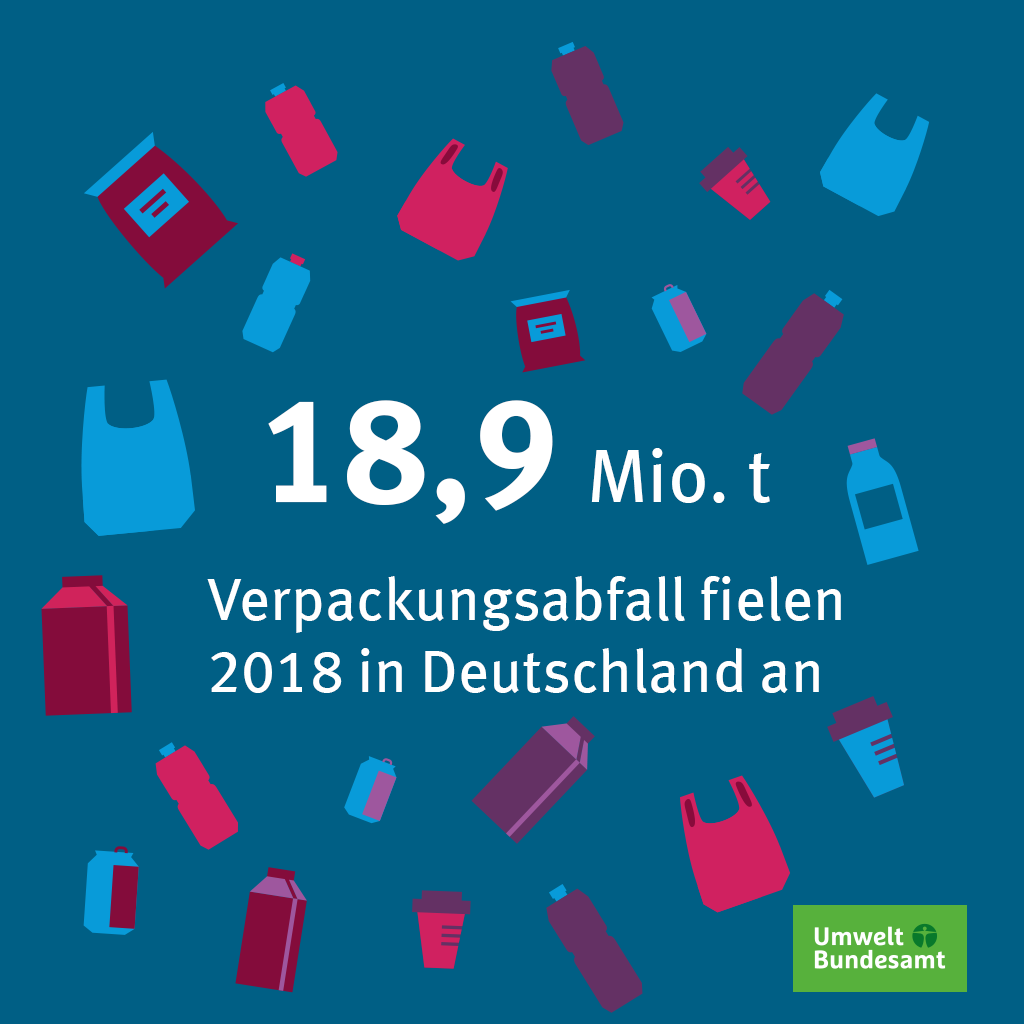 In Deutschland fielen 2018 insgesamt 18,9 Millionen Tonnen Verpackungsabfall an. Das sind 0,7 Prozent mehr als noch 2017. Pro Kopf entspricht dies durchschnittlich 227,5 kg Verpackungsabfall. Seit 2010 ist der Verpackungsverbrauch damit um 17,9 Prozent gestiegen. Das zeigt der aktuelle Bericht des Umweltbundesamtes (UBA) zu Aufkommen und Verwertung von Verpackungen in Deutschland. Private Endverbraucher verursachen von der Gesamtmenge 47 Prozent, also über 8,9 Millionen Tonnen oder 107,7 kg pro Kopf. Das sind 1,0 Prozent mehr als im Vorjahr und 20,6 Prozent mehr als 2010. Dirk Messner, Präsident des UBA: „Verpackungen sollten vermieden werden, bevor sie überhaupt anfallen. Mehrwegbecher beispielsweise für den Coffee-To-Go müssen die Regel werden, aber auch wer Essen mitnimmt, sollte dies in Mehrwegbehältern tun können. Die Flut an Pizzakartons und Kaffeebechern in Mülleimern und Parks hätte so ein Ende."