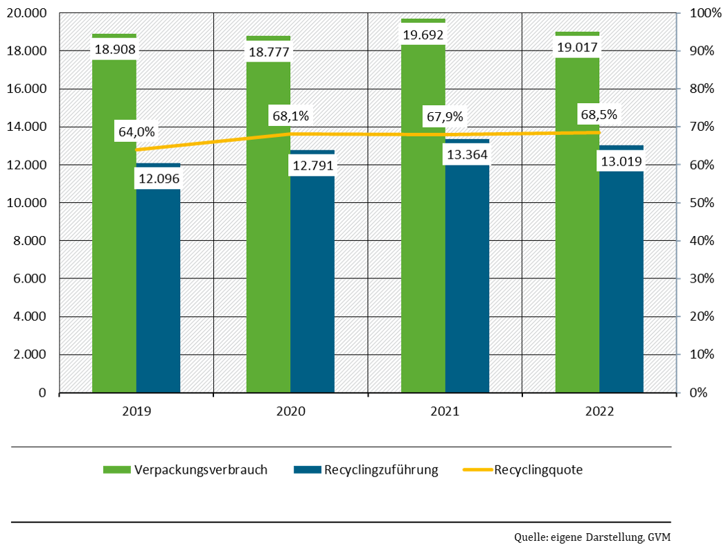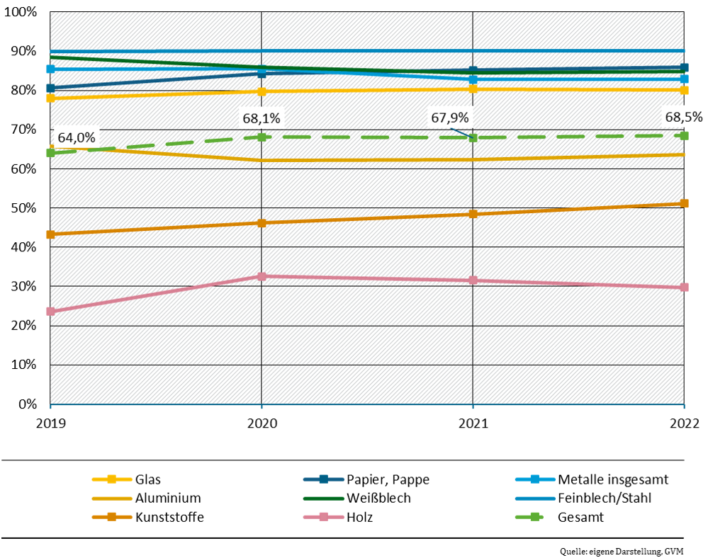 Die Recyclingquote zur Berichterstattung an die EU bezieht sich auf den Anteil der dem jeweiligen Recyclingprozess im letzten Recyclingschritt zugeführten Verpackungsabfallmenge im Verhältnis zum Verpackungsverbrauch. Die Recyclingzuführungsmenge ist im Vergleich zu den Verpackungsverbrauchsmengen niedriger, da hier die Verluste berücksichtigt werden, die zum Beispiel durch Aussortierung der nicht recycelbaren Mengen entstehen, die nicht in einem Recyclingprozess landen, sondern energetisch verwertet werden. Die Recyclingquote bildet somit nicht die Menge der recycelten Materialien (Output aus dem Recycling) ab, sondern die Zuführung zum letzten Recyclingschritt.