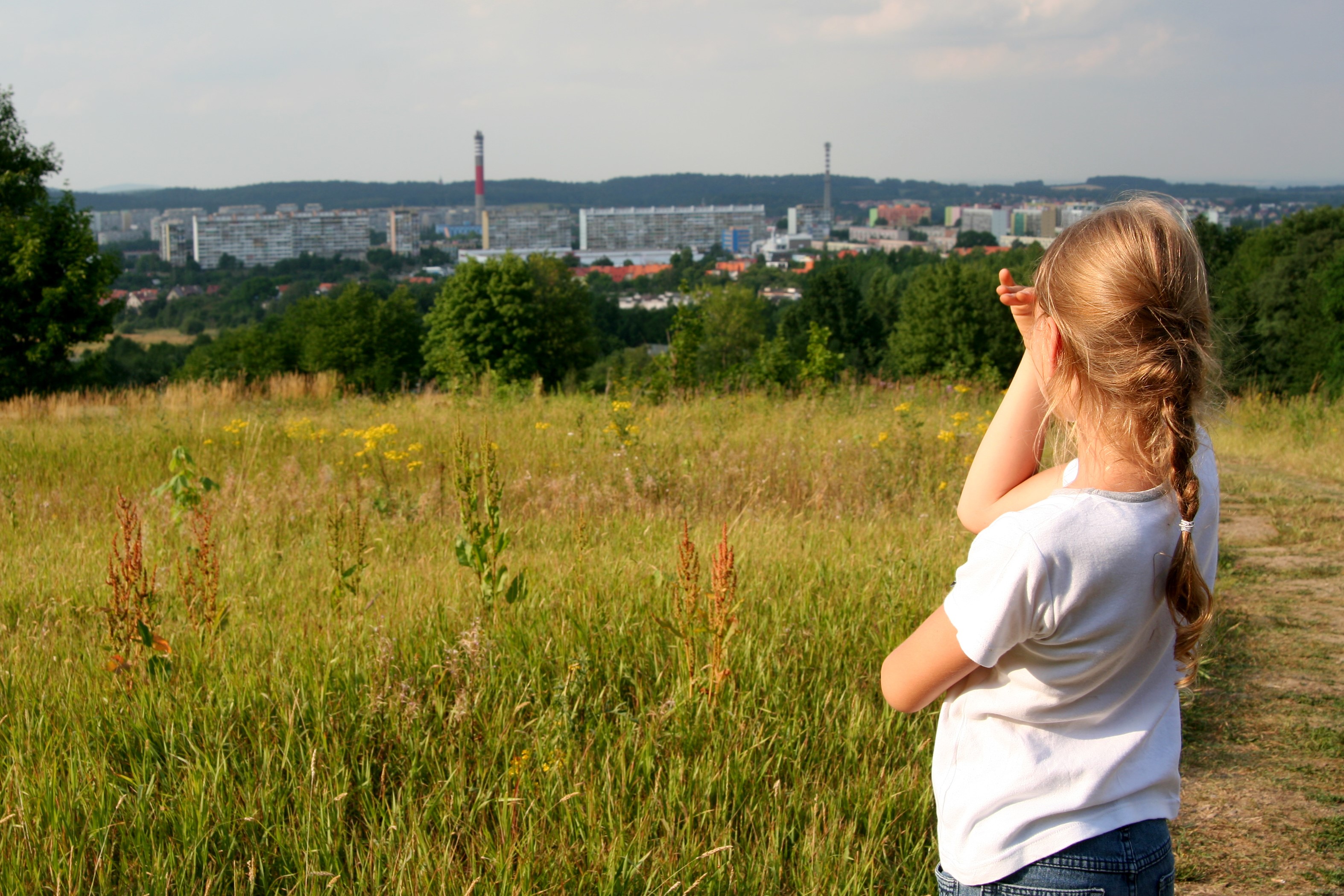 Kind auf einem Feld schau auf die entfernte Stadt.