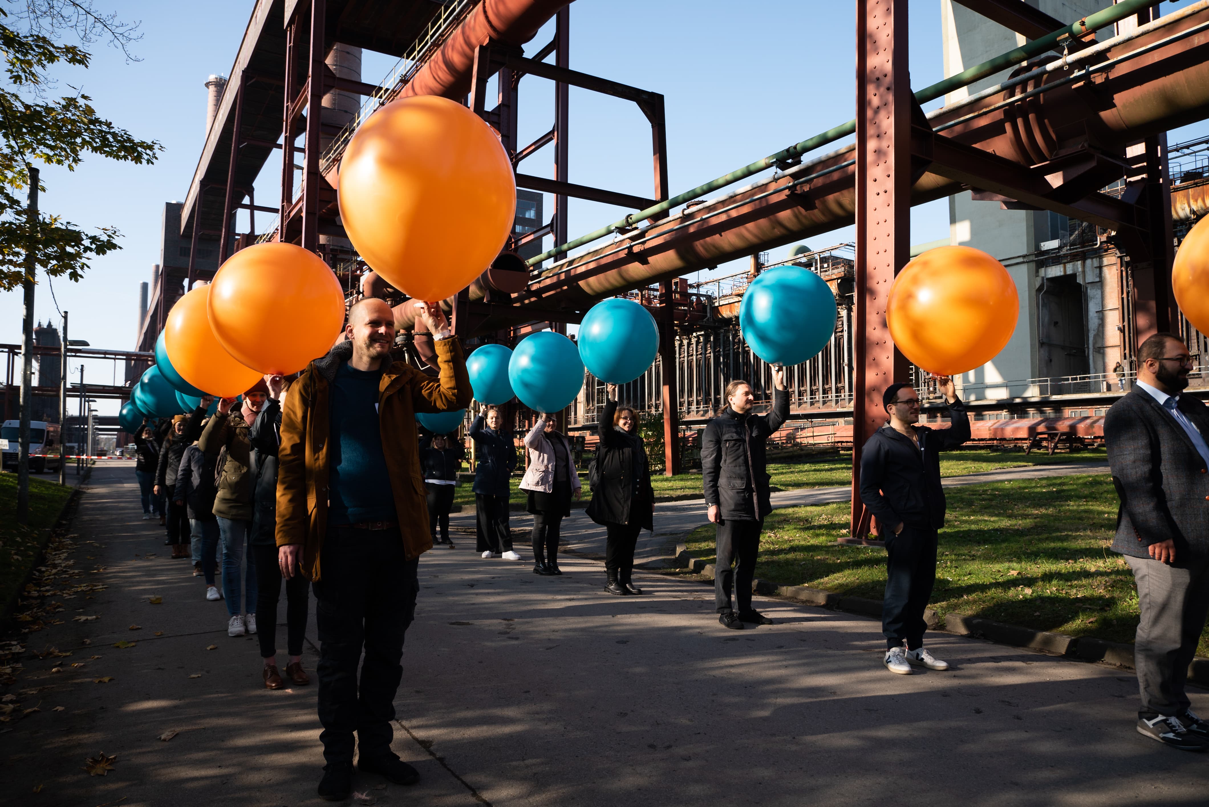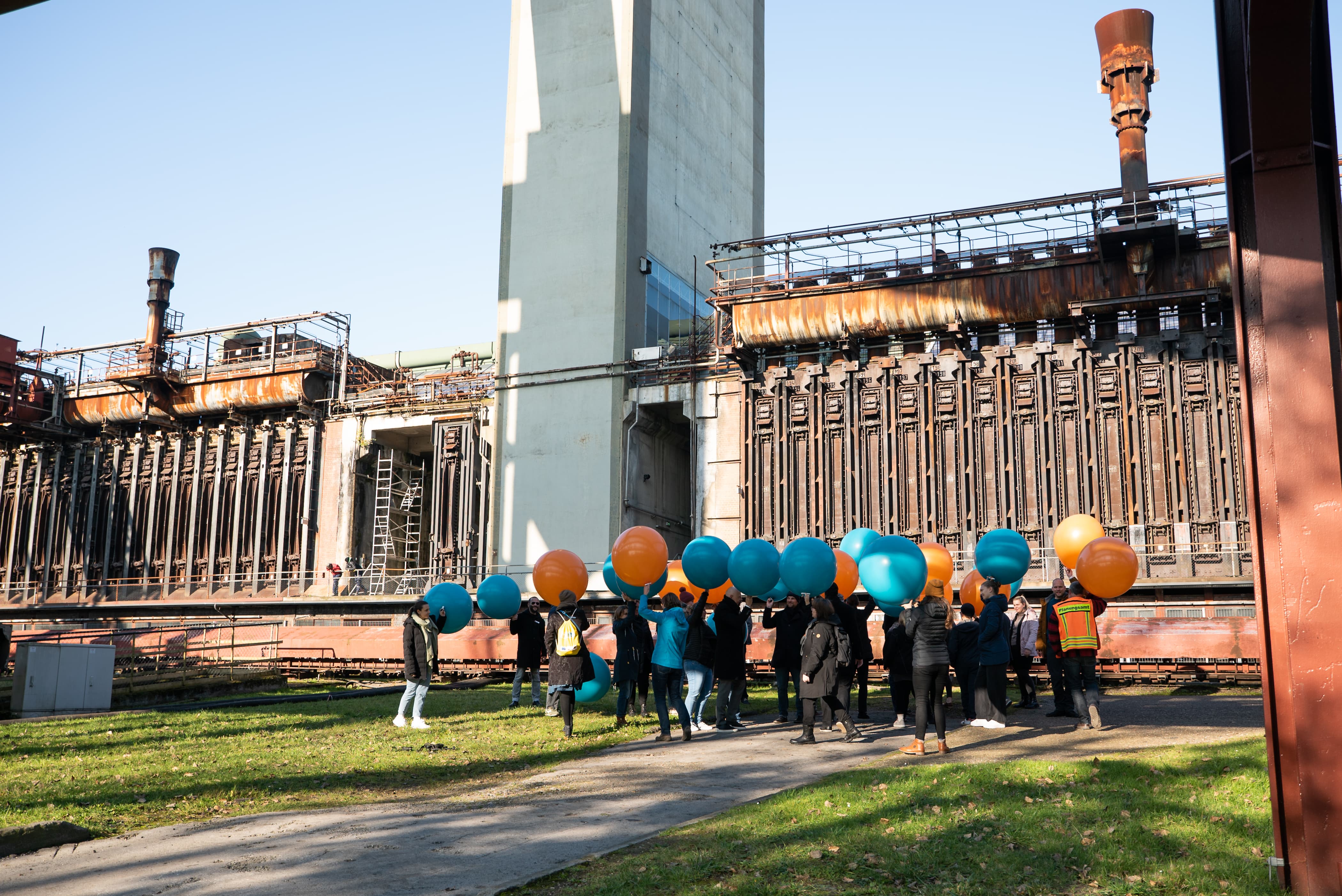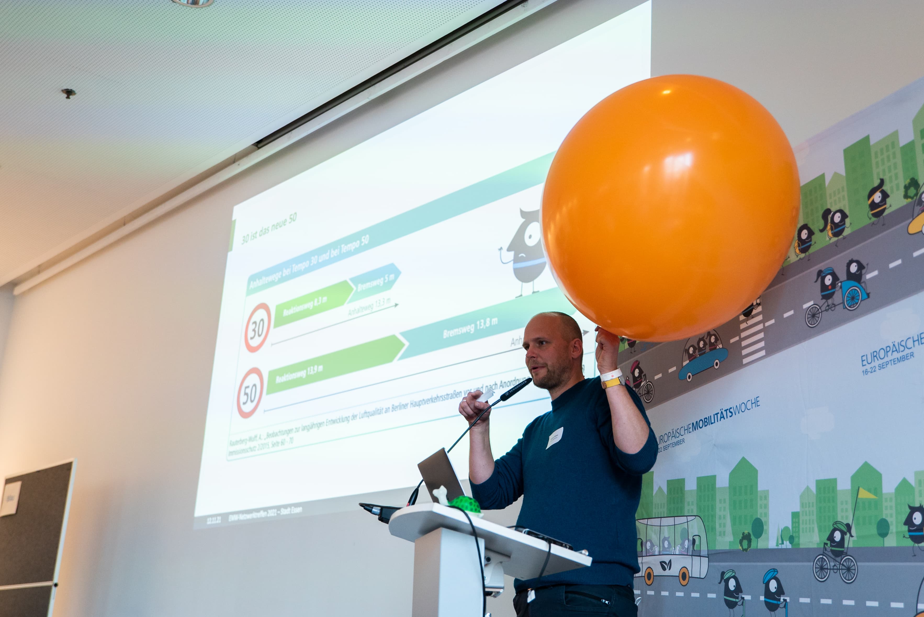 Der zweite Tag griff zu Beginn noch einmal die Kooperation unter den Kommunen und ihre Bedarfe zur Unterstützung der EMW-Arbeit vor Ort im klassischen World-Café-Format auf und führte zu konstruktiven Gesprächen und Lösungsvorschlägen. Kreativer Höhepunkt war die anschließende Aktion der Teilnehmenden im öffentlichen Straßenraum: Auf dem Gelände der Zeche Zollverein visualisierten sie mit verschiedenfarbigen Ballons den gravierenden Unterschied des Bremswegs bei Tempo 30 und Tempo 50. Die Aufnahmen mit einer Drohne aus der Vogelperspektive dokumentierten die Aktion eindrucksvoll in Bild- und Video-Formaten. Mit Reflexion und Ausblick schloss der zweite Tag und damit das EMW-Netzwerktreffen 2021.