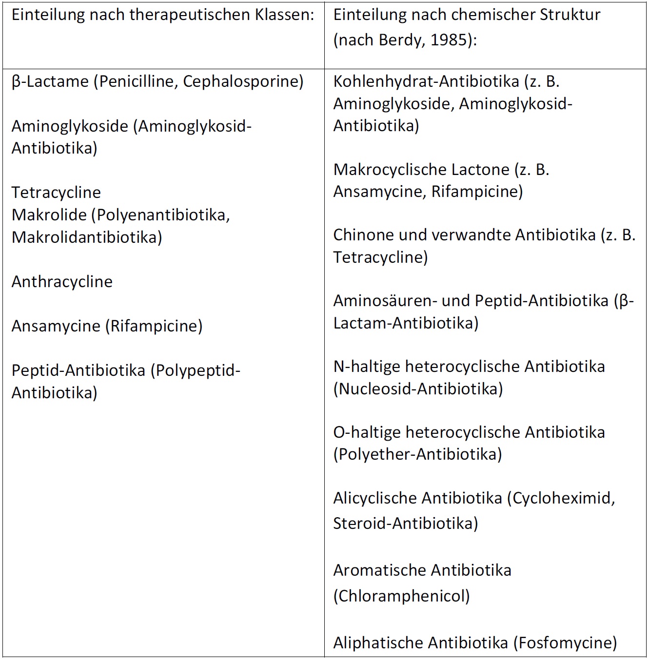 „Die Zahl der isolierten Antibiotika wird auf ca. 8.000 geschätzt. Davon sind etwa 100 (einschließlich der semisynthetischen Antibiotika) in der Medizin anwendbar. Die Antibiotika gehören sehr verschiedenen chemischen Stoffklassen an. Entsprechend erfolgt ihre Einteilung vorwiegend nach der chemischen Struktur (vgl. Tab. 1)“.6