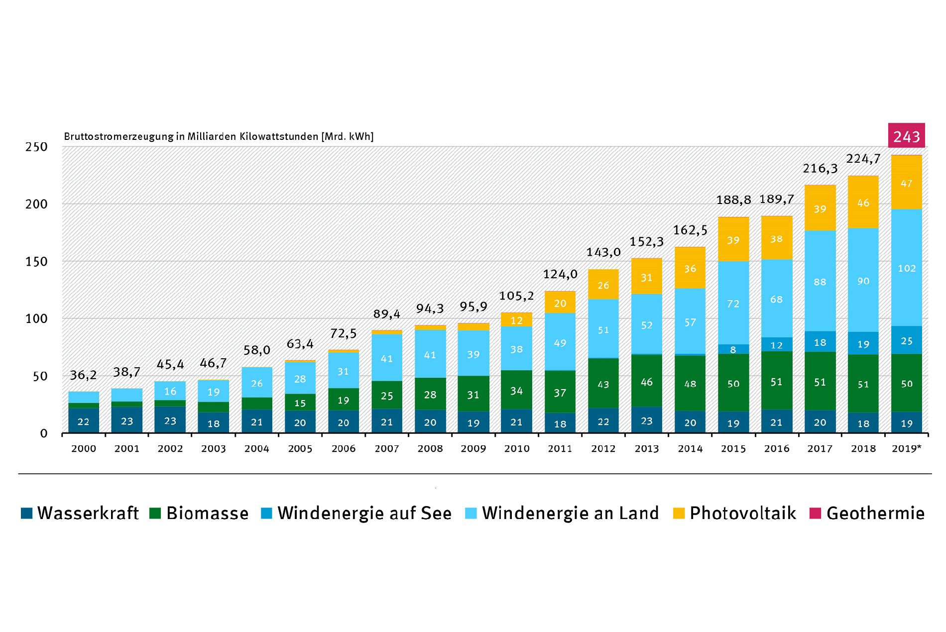 Die Stromerzeugung aus erneuerbaren Quellen ist im Jahr 2019 deutlich um über acht Prozent angestiegen. Sie deckt nun 42 Prozent des Stromverbrauchs (2018: 37,8 Prozent). Insgesamt wurden im Jahr 2019 nach derzeitigem Datenstand über 243 Milliarden Kilowattstunden Strom aus erneuerbaren Energien gewonnen. Damit wurde erstmals deutlich mehr Strom aus erneuerbaren Energien erzeugt, als aus Stein- und Braunkohlekraftwerken zusammen. Das Wachstum im Jahr 2019 wurde von einer stark gestiegenen Windstromerzeugung getragen. Neben dem Leistungszubau der Vorjahre liegen die Gründe hierfür in guten Windbedingungen im letzten Jahr. Während sich die Stromerzeugung aus Biomasse kaum änderte, stieg die Stromproduktion aus PV-Anlagen und Wasserkraftanlagen leicht an.