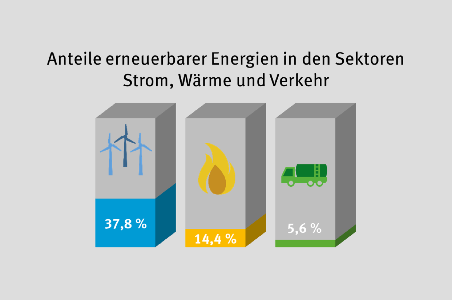 Danach gab es im Strombereich lediglich kleinere Änderungen. Der Anteil der erneuerbaren Energien am Bruttostromverbrauch bleib wie in den bisher veröffentlichten Publikationen bei 37,8 Prozent für das Jahr 2018. Im Wärmebereich führten neue Datengrundlagen und methodische Weiterentwicklungen zu Änderungen insbesondere im Bereich der Biomassen. Des Weiteren sorgte ein insgesamt geringerer (fossiler) Endenergieverbrauch für Wärme zu einer Anpassung des Anteilswertes. Insgesamt lag der Anteil der erneuerbaren Energieträger am Endenergieverbrauch für Wärme und Kälte im Jahr 2018 bei 14,4 Prozent – 0,2 Prozentpunkte mehr als nach bisherigen Zahlen. Im Verkehrsbereich stieg der Anteil der erneuerbaren Energien um 0,1 Prozentpunkte gegenüber dem letzten Datenstand auf nunmehr 5,6 Prozent.