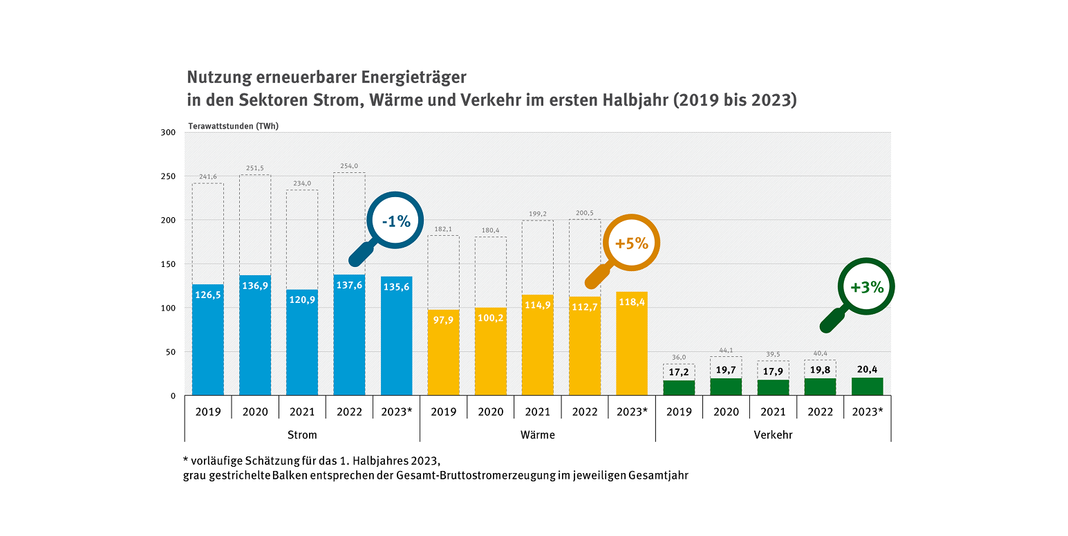 vor Kurzem wurde der Monatsbericht Plus zur Entwicklung der Erneuerbaren Energien in Deutschland im ersten Halbjahr 2023 veröffentlicht. Damit präsentiert die Arbeitsgruppe Erneuerbare Energien-Statistik (AGEE-Stat) erste Daten zur Entwicklung der erneuerbaren Energien in den Bereichen Strom, Wärme und Verkehr für das erste Halbjahr 2023.