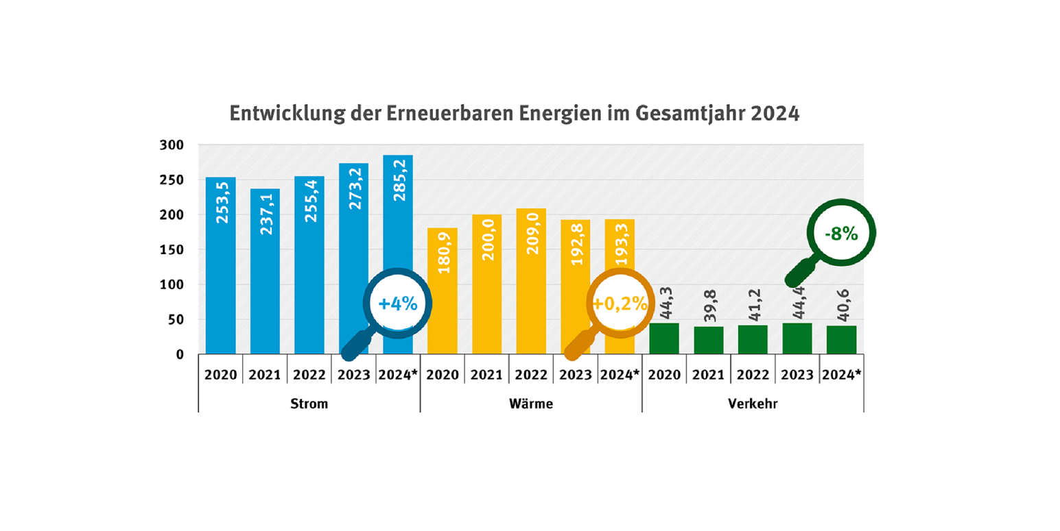 vor Kurzem wurde der Monatsbericht Plus zur Entwicklung der erneuerbaren Energien in Deutschland im Gesamtjahr 2024 veröffentlicht. Damit präsentiert die Arbeitsgruppe Erneuerbare Energien-Statistik (AGEE-Stat) erste Schätzungen zur Entwicklung der erneuerbaren Energien in den Bereichen Strom, Wärme und Verkehr für das Gesamtjahr 2024. Dieser Newsletter gibt Ihnen eine Kurzzusammenfassung der Ergebnisse und alle wichtigen Links zu den neuen Daten.