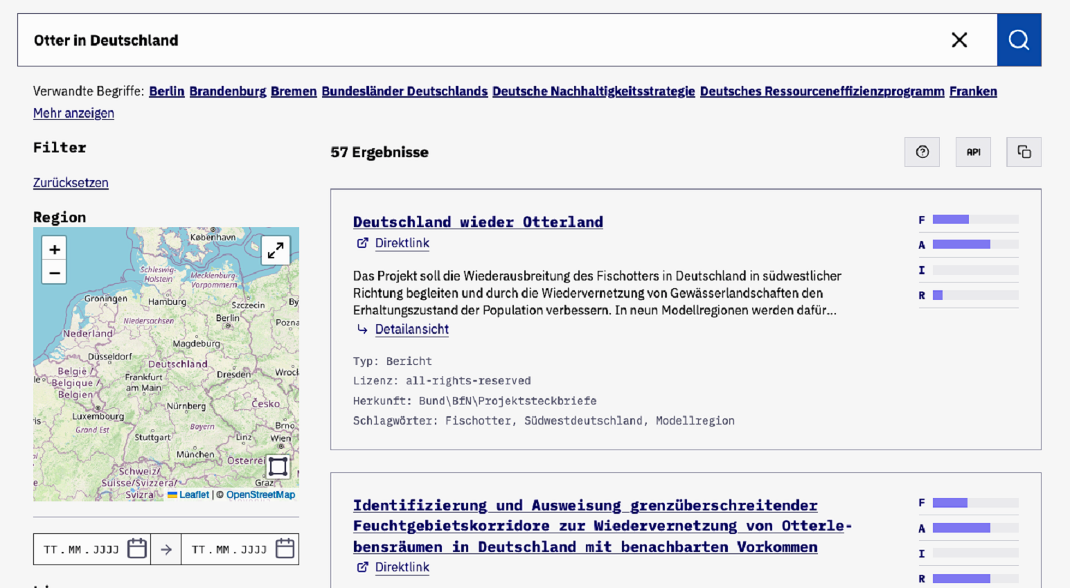 Screenshot: Suchanfrage und Teilergebnisliste zur Anfrage "Otter in Deutschland" auf umwelt.info