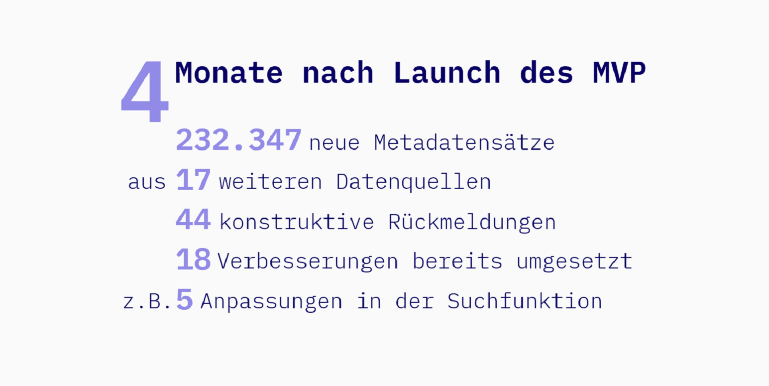 Unser Minimum Viable Product geht damit in seine finale Phase und wir blicken zurück auf einen erkenntnisreichen Austausch mit den Nutzenden. Durch die Rückmeldungen sind viele neue Features und Verbesserungen für unser Portal entstanden. Wir freuen uns über weiteres Feedback und den Austausch mit unseren Nutzenden, unter anderem in drei anstehenden Workshops.