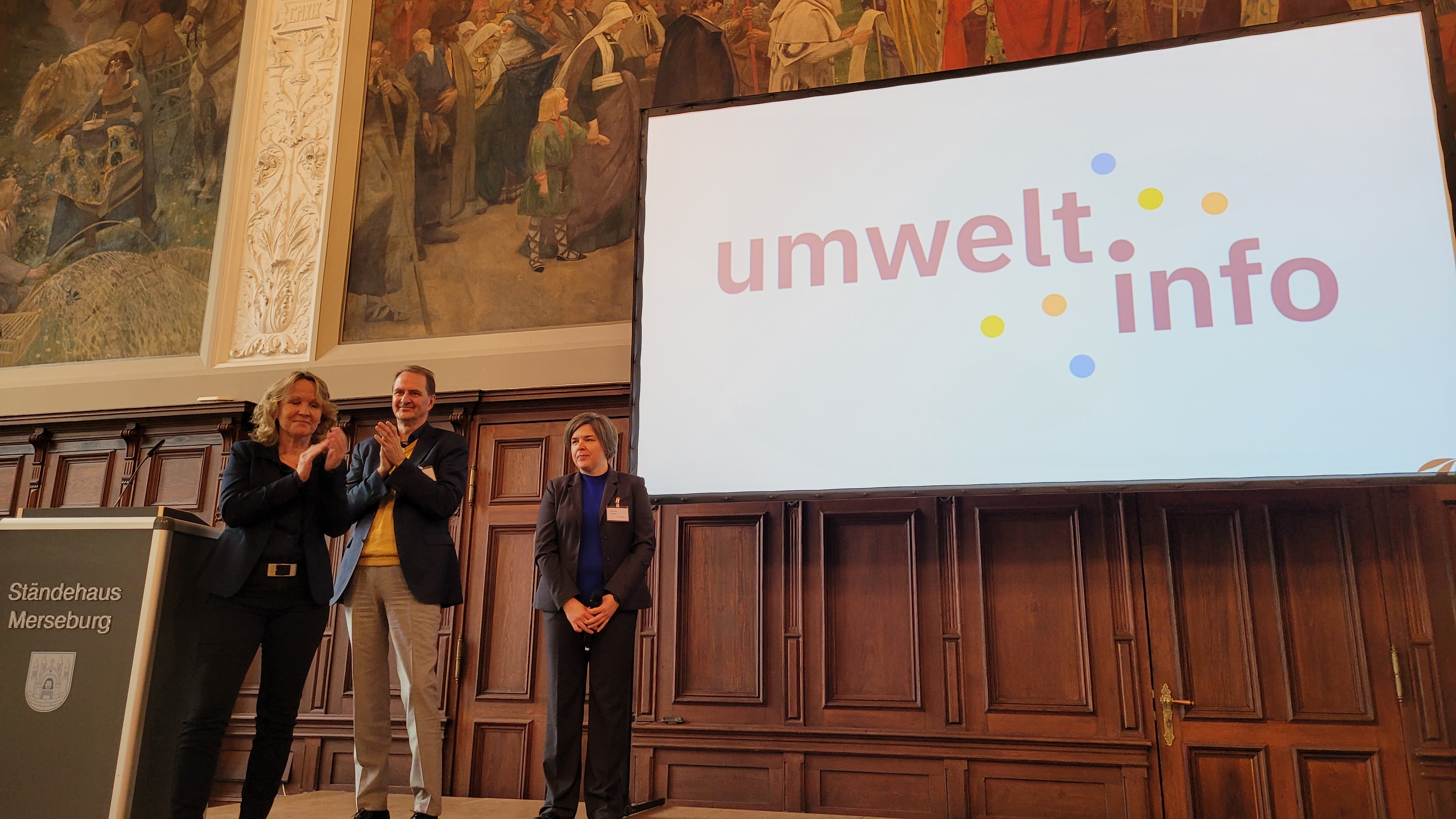 Bundesumweltministerin Steffi Lemke, UBA-Präsident Dirk Messner und Anja Reineke, Leiterin von umwelt.info am UBA, beim feierlichen Start des Portals umwelt.info am 27. Januar 2025 im Ständehaus Merseburg.